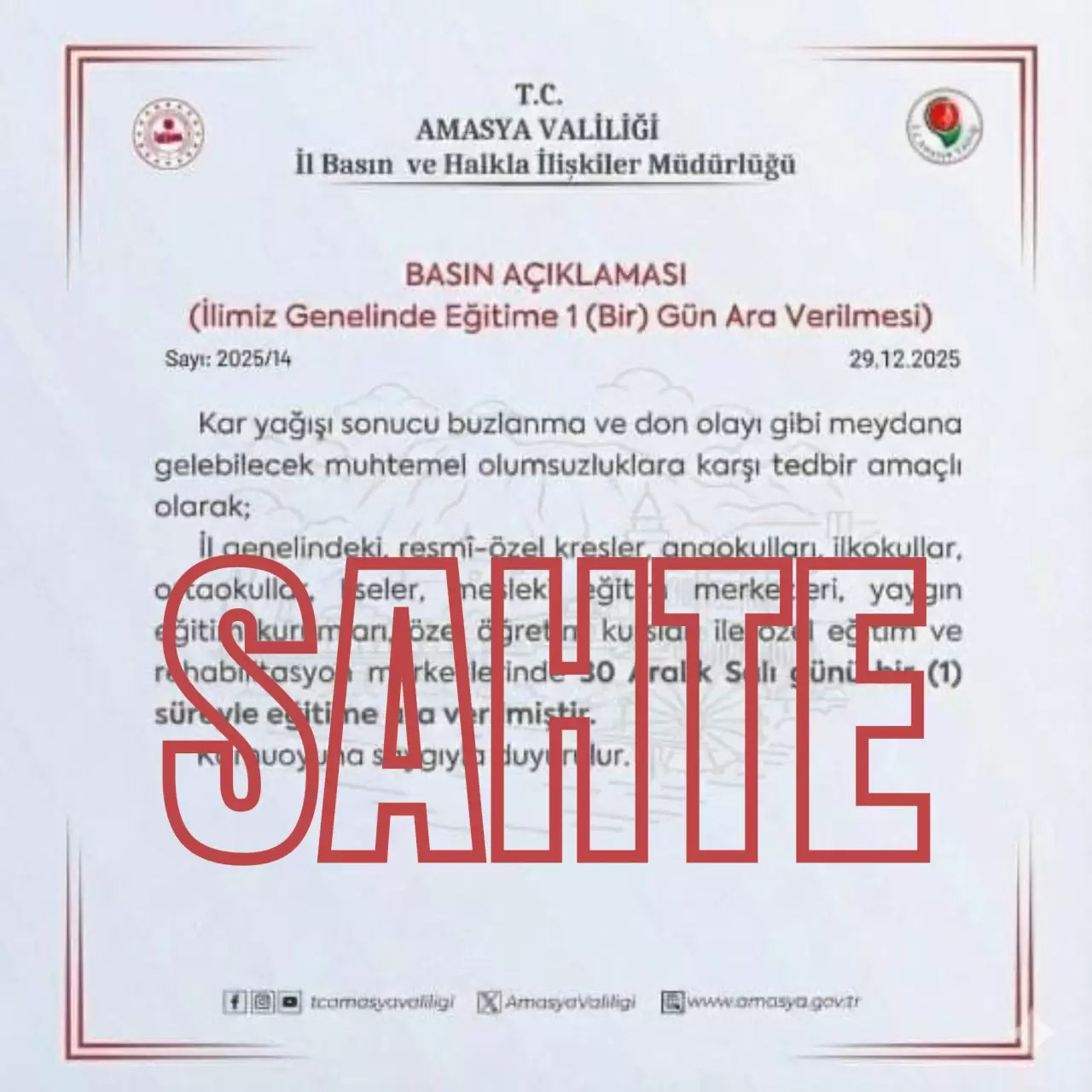 Amasya Valiliği, İl Basın ve Halkla İlişkiler Müdürlüğü tarafından yapılmış gibi gösterilen ‘kar tatili’ paylaşımlarının asılsız olduğunu açıkladı.