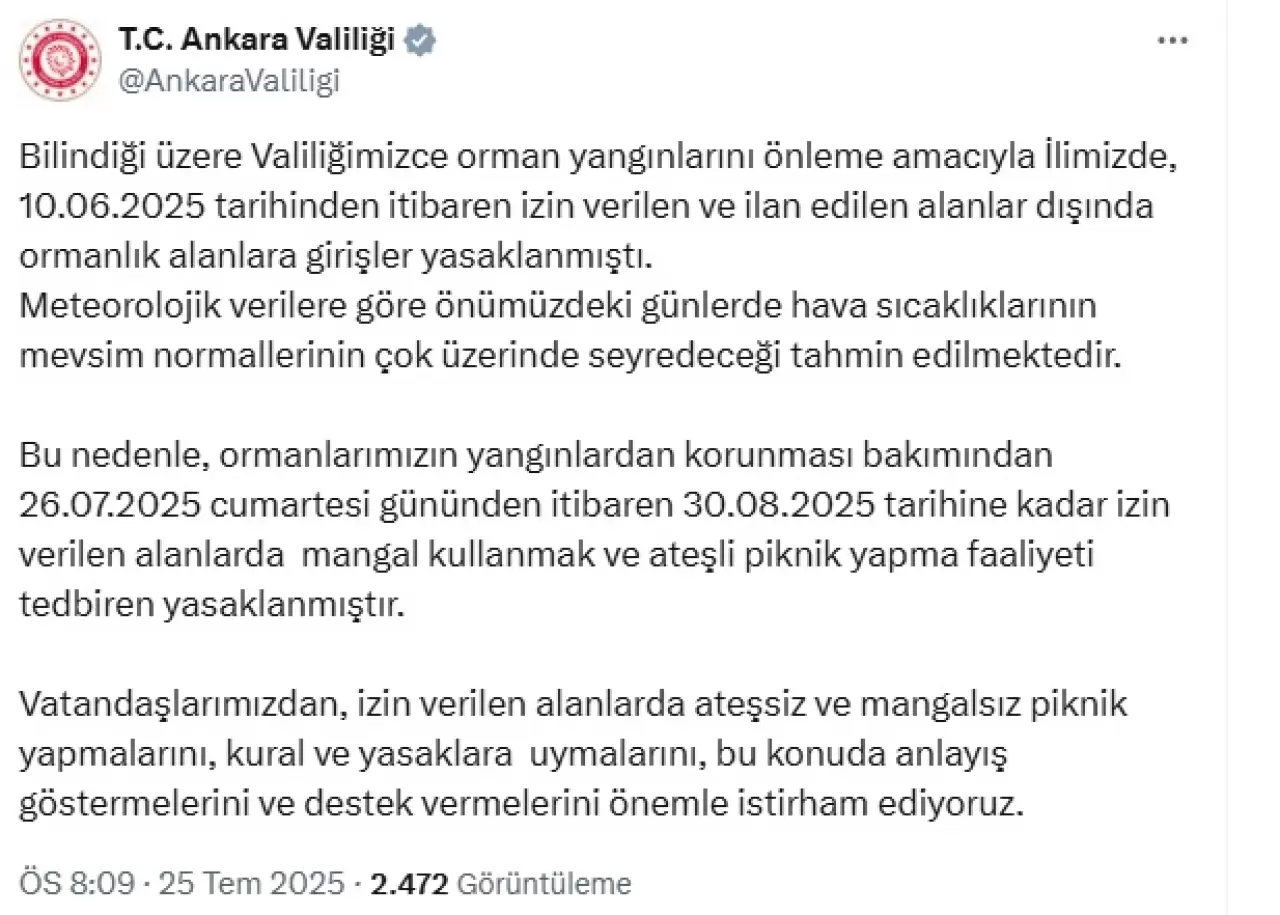 Ankara Valiliği sosyal medya hesabından yaptığı paylaşımda, valilik tarafından orman yangınlarını önleme amacıyla Ankara’da, 10 Haziran 2025 tarihinden itibaren izin verilen ve ilan edilen alanlar dışında ormanlık alanlara girişlerin yasaklandığı hatırlatılarak, “Meteorolojik verilere göre önümüzdeki günlerde hava sıcaklıklarının mevsim normallerinin çok üzerinde seyredeceği tahmin edilmektedir. Bu nedenle, ormanlarımızın yangınlardan korunması bakımından 26 Temmuz 2025 cumartesi gününden itibaren 30 Ağustos 2025 tarihine kadar izin verilen alanlarda mangal kullanmak ve ateşli piknik yapma faaliyeti tedbiren yasaklanmıştır. Vatandaşlarımızdan, izin verilen alanlarda ateşsiz ve mangalsız piknik yapmalarını, kural ve yasaklara uymalarını, bu konuda anlayış göstermelerini ve destek vermelerini önemle istirham ediyoruz” ifadeleri kullanıldı.