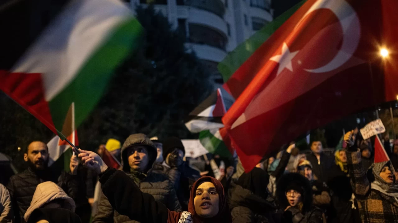 Ankara Filistin Dayanışma Platformu (ANFİDAP) üyeleri, Tuğba Altınok Camisi'nde kılınan teravih namazının ardından ellerinde "Soykırım devam ediyor", "Soykırımı durdurun" yazılı pankartlarla ABD'nin Ankara Büyükelçiliği önüne yürüdü.