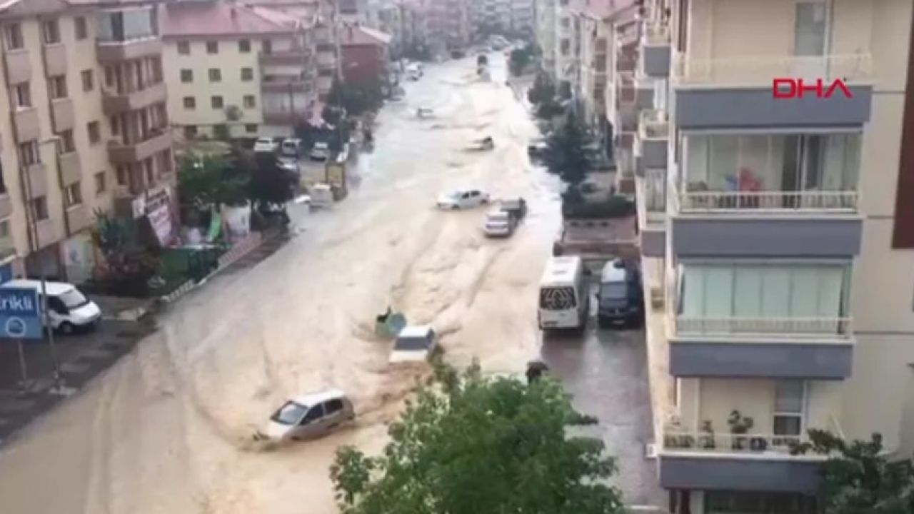 Ankara'nın Mamak ilçesinde etkili olan sağanak sonrası meydana gelen selde otomobiller ve çöp konteynerleri sürüklendi, iş yerlerini su bastı.