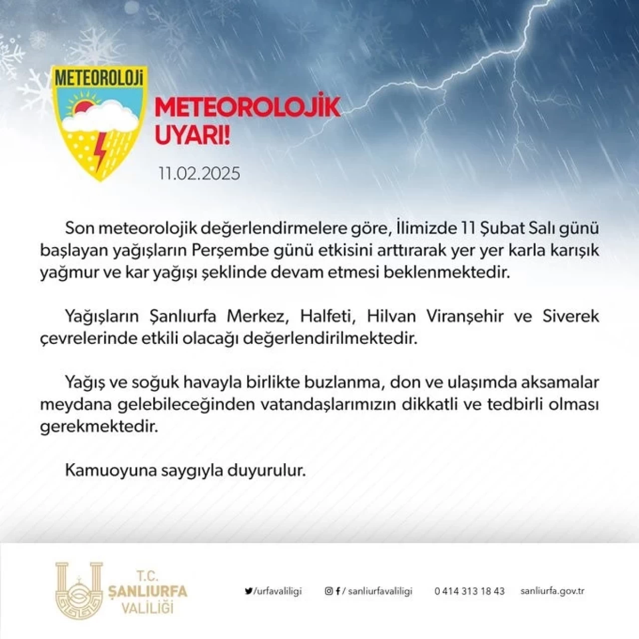 Valilik tarafından yapılan yazılı uyarıda, " Son meteorolojik değerlendirmelere göre ilimizde 11 şubat Salı günü başlayan yağışların Perşembe günü etkisini arttırarak yer yer karla karışık yağmur ve kar yağışı şeklinde devam etmesi beklenmektedir. Yağışların Şanlıurfa merkez, Halfeti, Hilvan, Viranşehir ve Siverek çevrelerinde etkili olacağı değerlendirilmektedir. Yağış ve soğuk havayla birlikte buzlanma, don ve ulaşımda aksamalar meydana gelebileceğinden vatandaşlarımızın dikkatli ve tedbirli olması gerekmektedir" dendi.