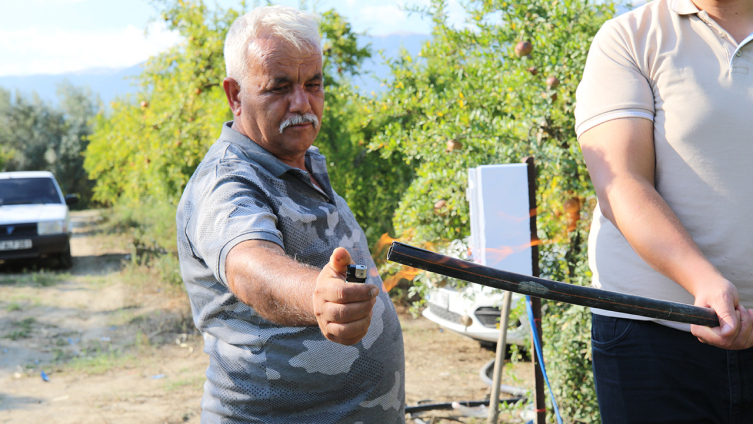 Bu nedenle sondajla su çıkarmaya ihtiyaç duyduklarını anlatan Tokgöz, "Çıkan suyu bir hafta havuzda depoladık. Bir ara suyun tadına baktım, gariplik vardı. Çakmakla bir deneme yaptım. Çakmağı çakınca kuyunun içi alev aldı. Üzerini kapatarak sönmesini sağladım. Sonra vana sistemi yapıp, gazı yüzeye çıkardım. Türkiye Petrolleri görevlilerini aradık, görüntüler gönderdik, konuyu araştıracaklarını söylediler. İnşallah burada gaz çıkar, buna vesile oluruz." dedi.