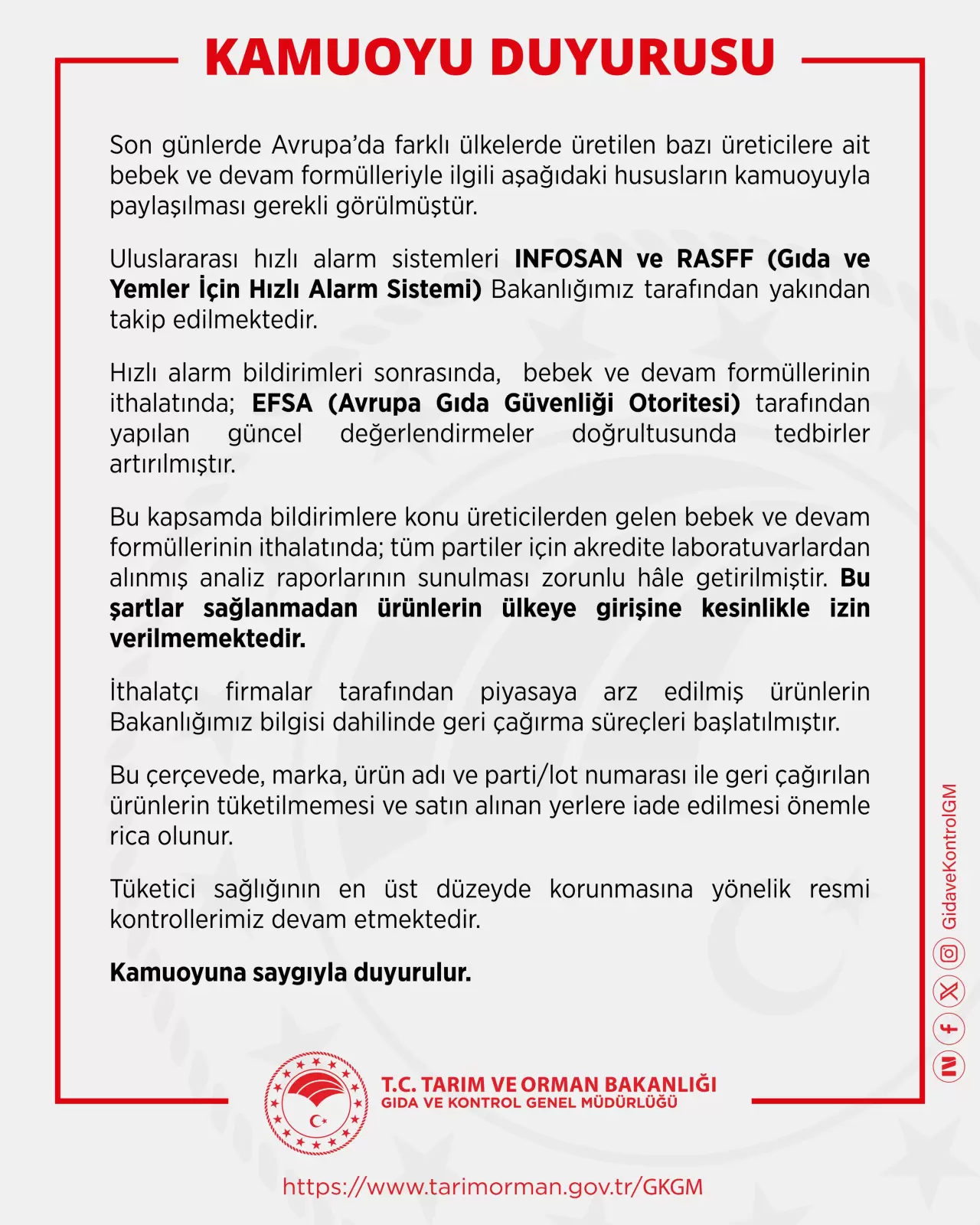 Uluslararası hızlı alarm sistemleri INFOSAN ve RASFF (Gıda ve Yemler için Hızlı Alarm Sistemi) bakanlığımız tarafından yakından takip edilmektedir. Hızlı alarm bildirimleri sonrasında, bebek ve devam formüllerinin ithalatında tedbirler artırılmıştır. Bildirimlere konu üreticilerden gelen ürünler için tüm partilere ait akredite laboratuvar analiz raporlarının sunulması zorunlu hale getirilmiştir.Bu şartlar sağlanmadan ürünlerin ülkeye girişine izin verilmemektedir. İthalatçı firmalar tarafından piyasaya arz edilmiş ürünlerin bakanlığımız bilgisi dahilinde geri çağırma süreçleri başlatılmıştır. Geri çağrılan ürünlerin tüketilmemesi ve satın alınan yerlere iade edilmesi önemle rica olunur.