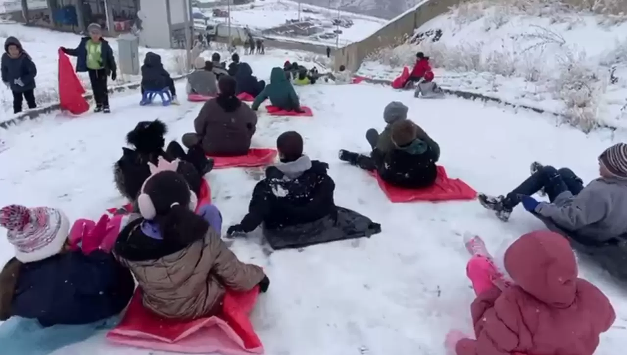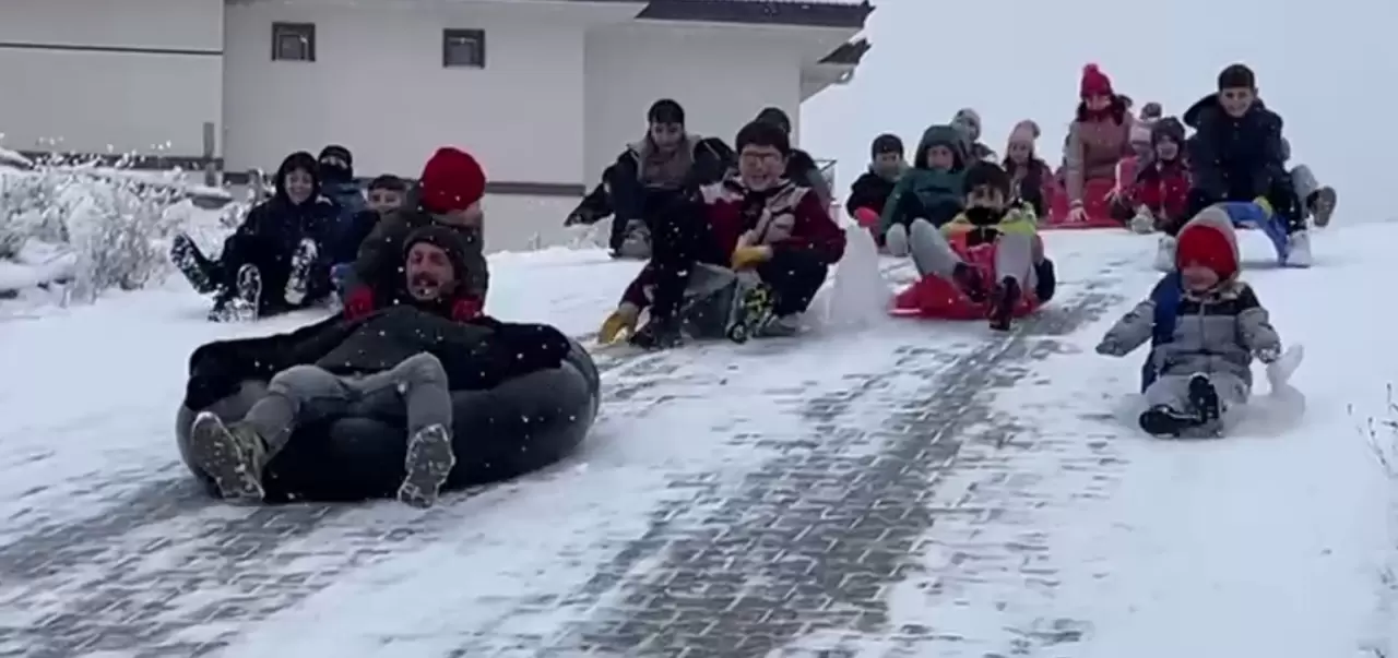 Miraç Yılmaz da “Arkadaşlarımla kaymak için alan oluşturduk. Poşetlerimizle kayıyoruz ve çok eğleniyoruz. Yılbaşı tatilini güzel geçiriyoruz” ifadelerini kullandı.