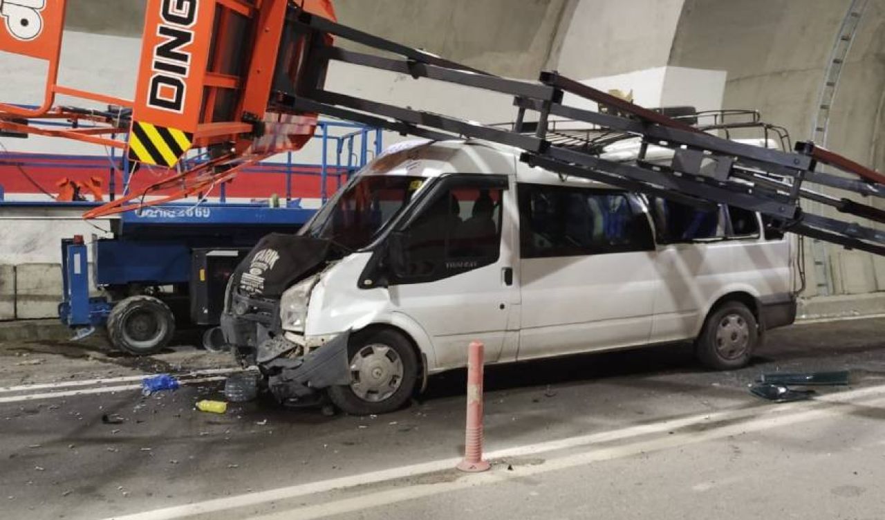 Artvin'de, tünel içinde aydınlatma çalışması yapan işçilerin bulunduğu "manlift" adı verilen asansöre bir yolcu minibüsü çarptı. Kazada 7 kişi yaralandı.