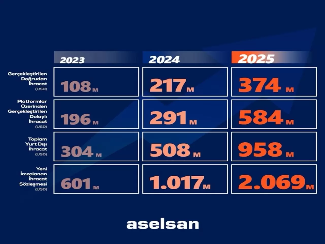 ASELSAN Genel Müdürü Akyol, sanal medya hesabından yaptığı açıklamada, "Milletimizin göz bebeği ASELSAN, her yıl büyüyen ihracat gücüyle yalnızca teknolojisini değil, Türkiye’ye duyulan güveni de dünyaya taşıyor. 58 ülke ile 2 milyar doların üzerinde yeni ihracat sözleşmesi, 16 ürünümüz için ilk ihracat sözleşmesi, 3 yeni ülke ile de ilk kez ihracat sözleşmesi imzaladık. İhracat yaptığımız ülke sayısını 95’e yükselttik. Hava savunma, radar, elektronik harp, güdümlü mühimmat ve haberleşme gibi doğrudan ihracatlarımızın yanında; uçak, SİHA, gemi ve kara platformlarına sunduğumuz sistemlerle de ihracatta büyümeye devam edeceğiz" dedi.