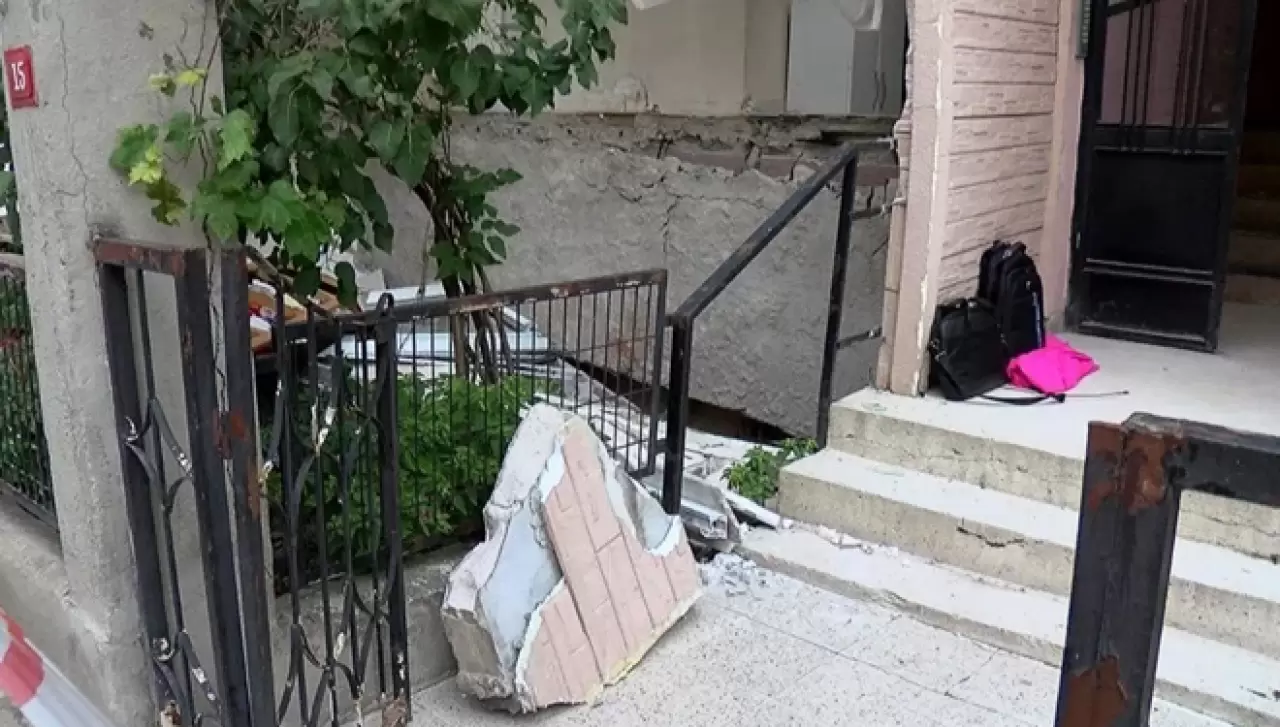 Ambarlı Mahallesi Erencan Sokak’taki 6 katlı binanın giriş katındaki balkon çöktü.