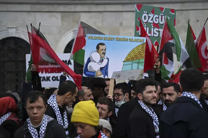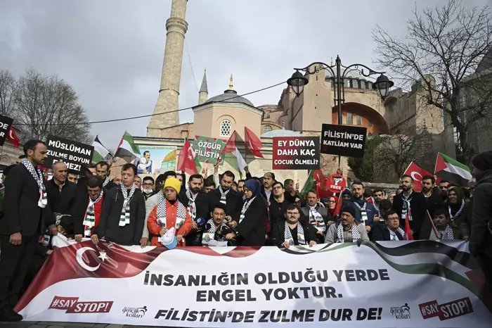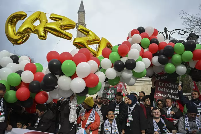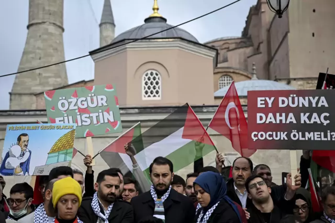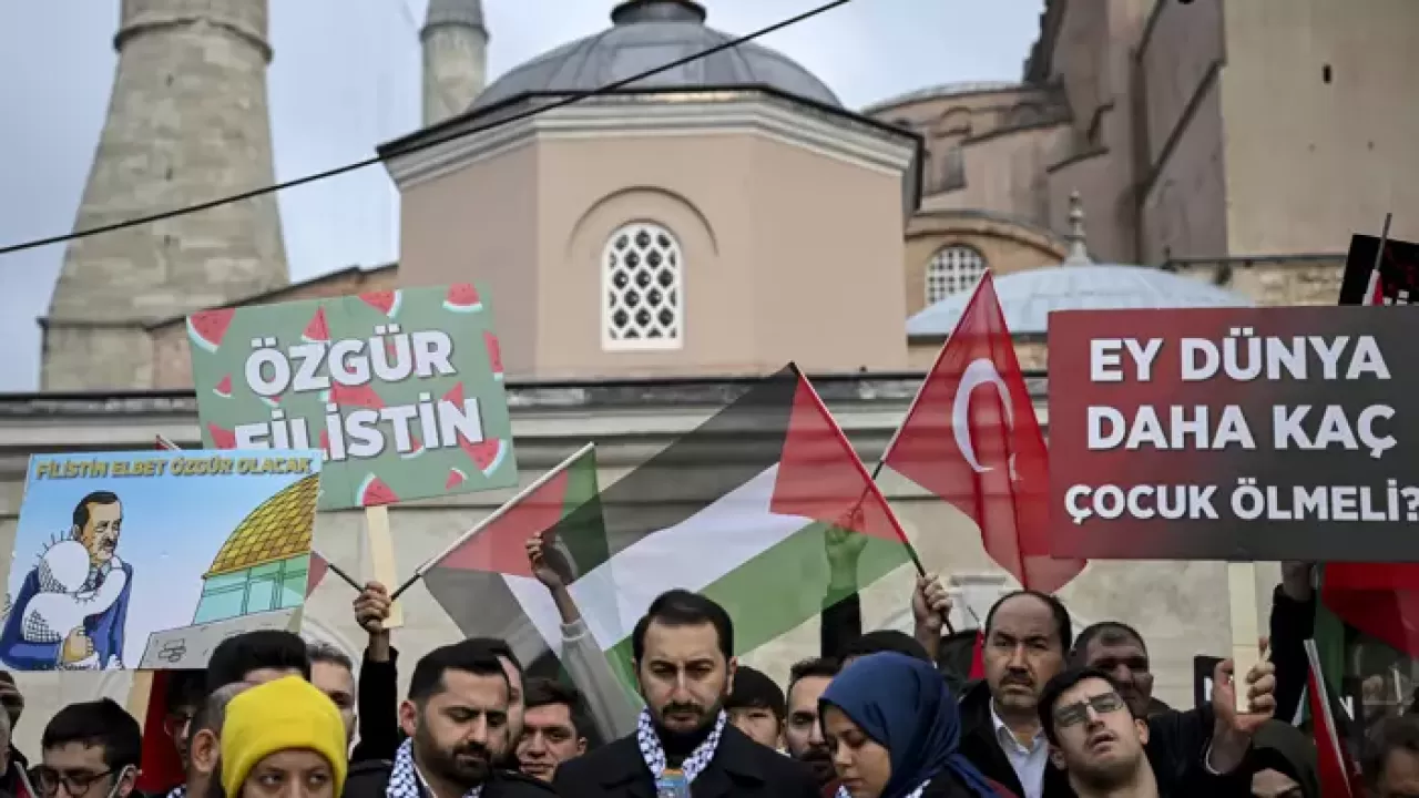 Topluluk, burada "Ey dünya, daha kaç çocuk ölmeli", "Sessiz kalma, soykırıma ortak olma" ve "Filistin'de katliam var" yazılı dövizler taşıyarak, "Katil İsrail" sloganları attı.