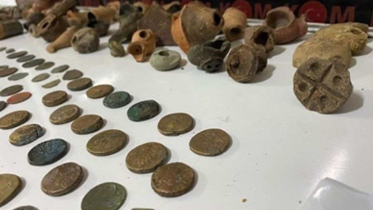 Evde yapılan aramada 313 sikke, tarihi eser niteliği taşıdığı belirtilen metal ya da topraktan yapılmış küçük boyutlu 62 eşya bulundu.