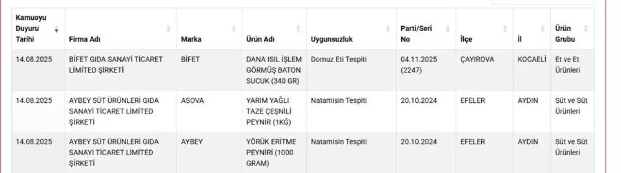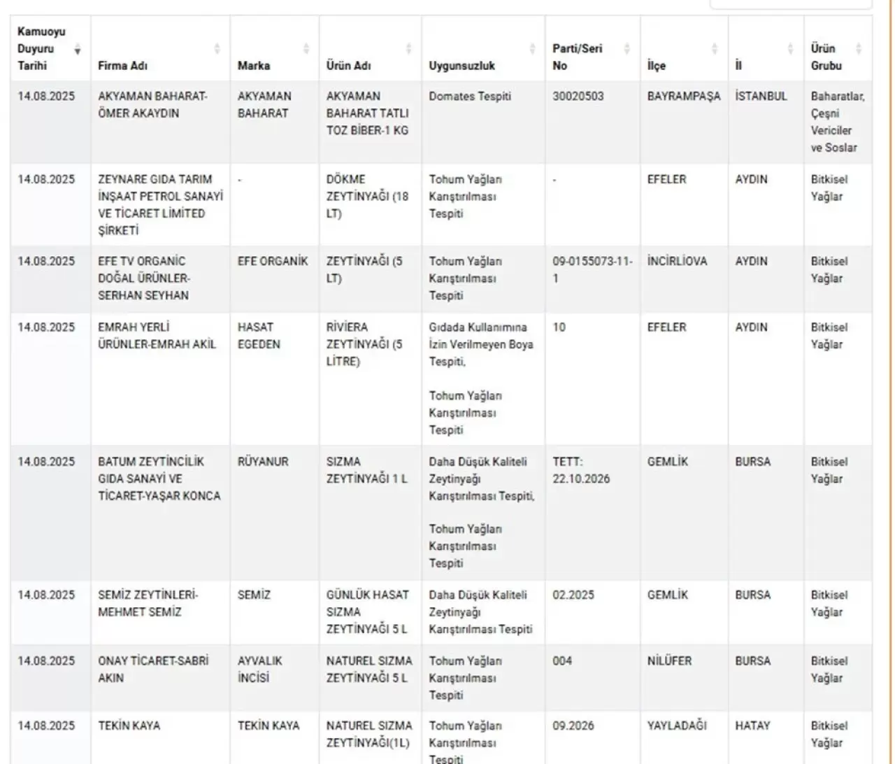 Bakanlığın 14 Ağustos 2025’te duyurduğu listeye göre uygunsuz bulunan markalar ve ürünler şöyle;