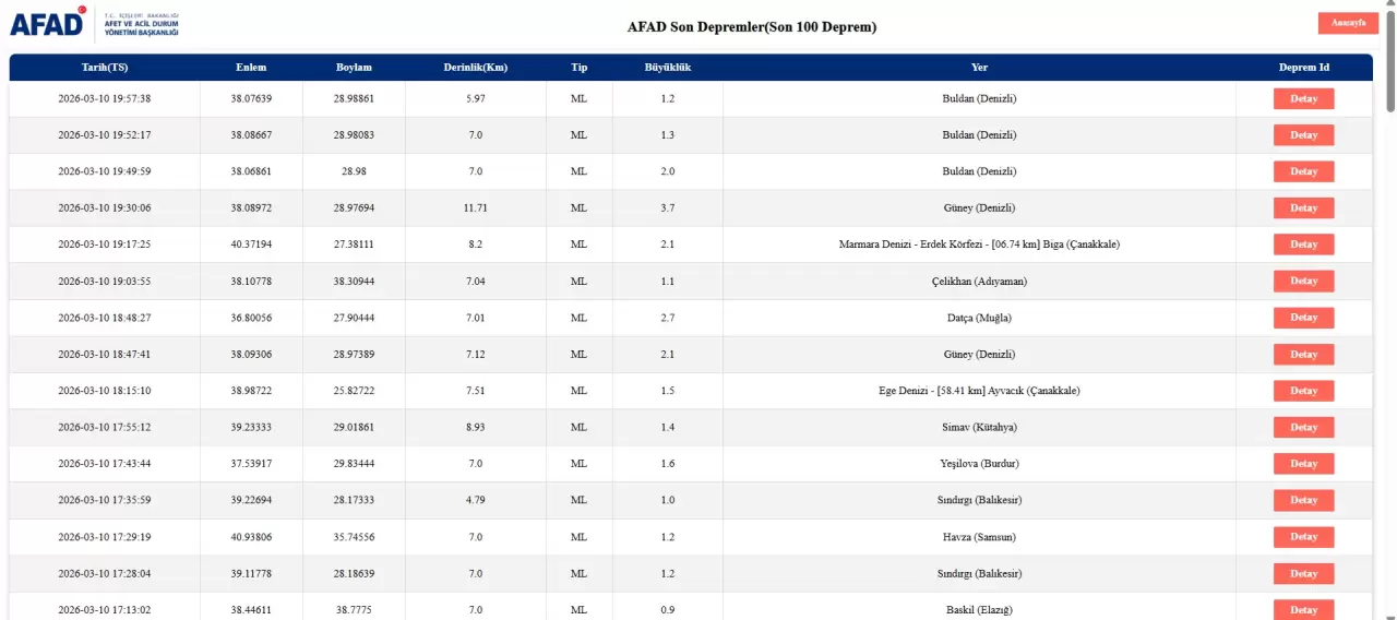 Afet ve Acil Durum Yönetimi Başkanlığı (AFAD) verilerine göre 10 Mart 2026’da Türkiye’nin farklı bölgelerinde küçük ve orta büyüklükte birçok deprem kaydedildi.