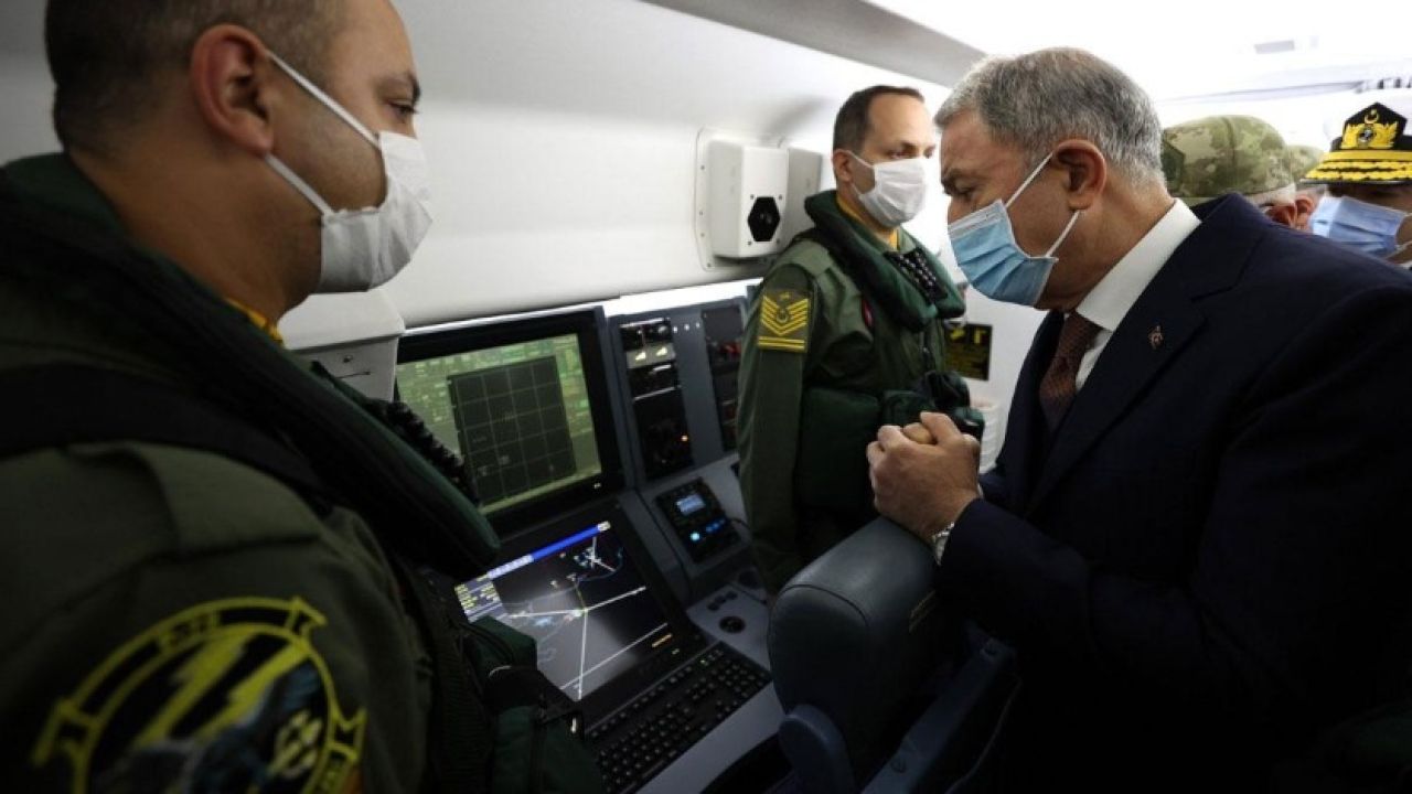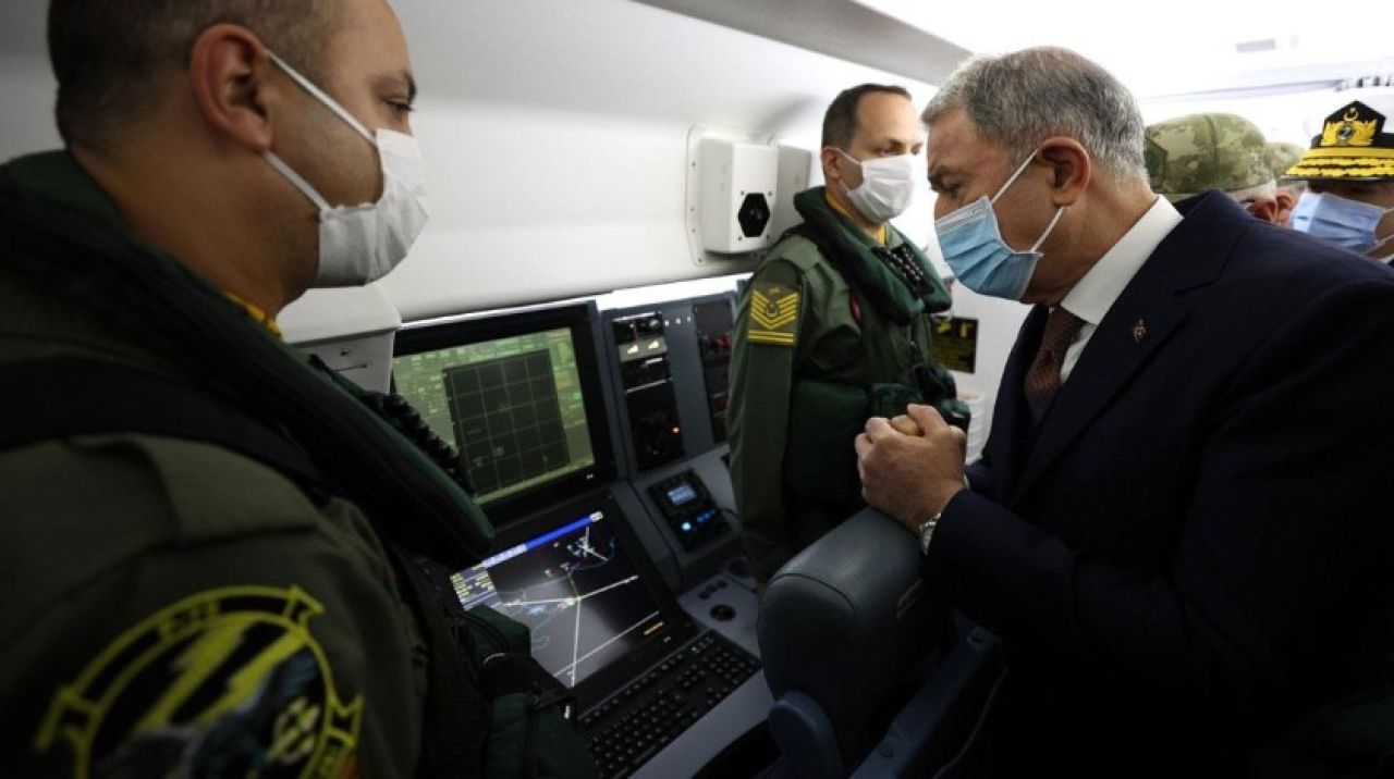 Donanma Komutanı Oramiral Ercüment Tatlıoğlu'ndan uçağa ilişkin bilgi alan Bakan Akar, personelle de sohbet etti.