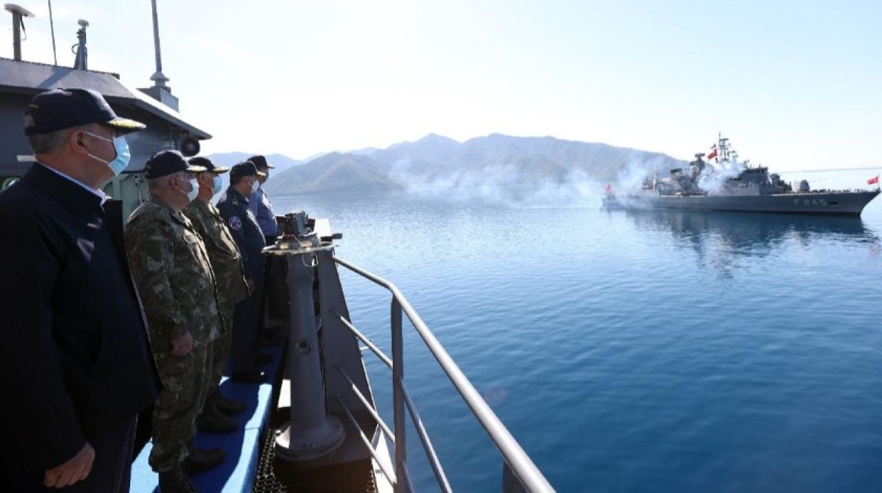 Limandan ayrılan Bakan Akar'ı taşıyan sancak gemisi için TCG Oruçreis tarafından 19 pare selamlama atışı yapıldı. SAS timlerinin taktik pençe harekatı ile denizde sürüklenen mayınları imha ettiği tatbikatta, SAT timleri de yeteneklerini sergiledi.
