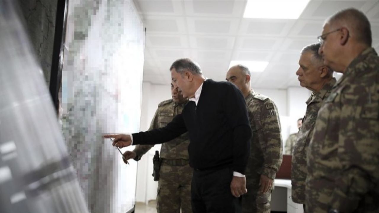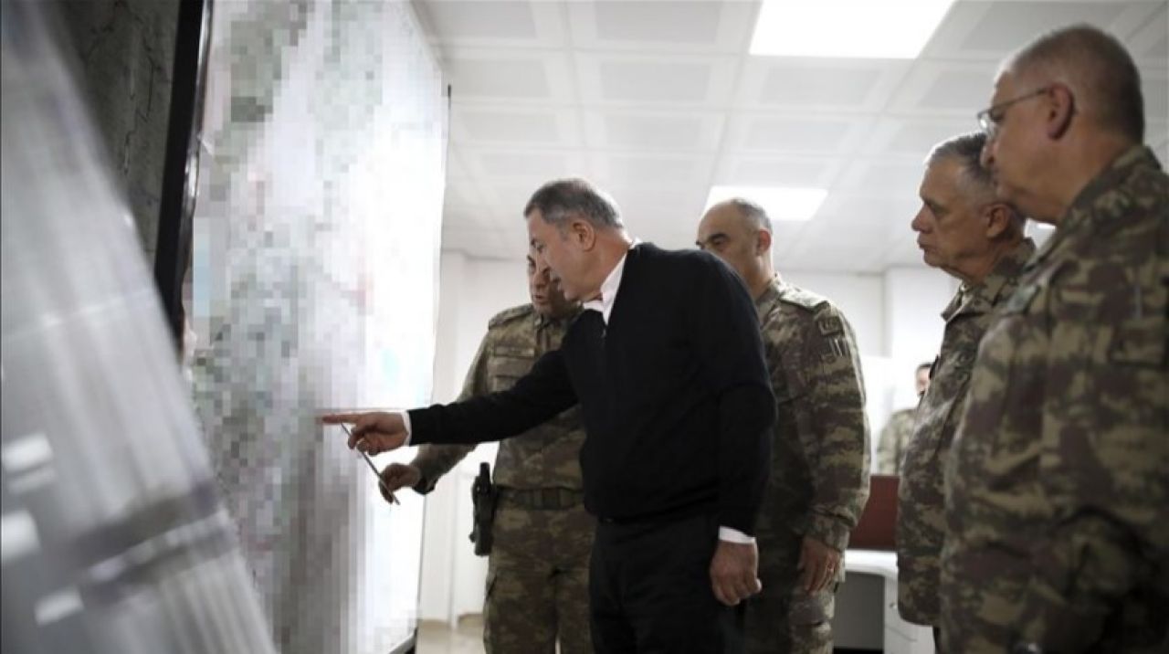 Akar, Orgeneral Güler, Kara Kuvvetleri Komutanı Orgeneral Ümit Dündar ve Hava Kuvvetleri Komutanı Orgeneral Hasan Küçükakyüz ile Suriye sınırının sıfır noktasındaki birlikleri ziyaret ederek, harekata ilişkin son bilgileri yerinde alıyor.