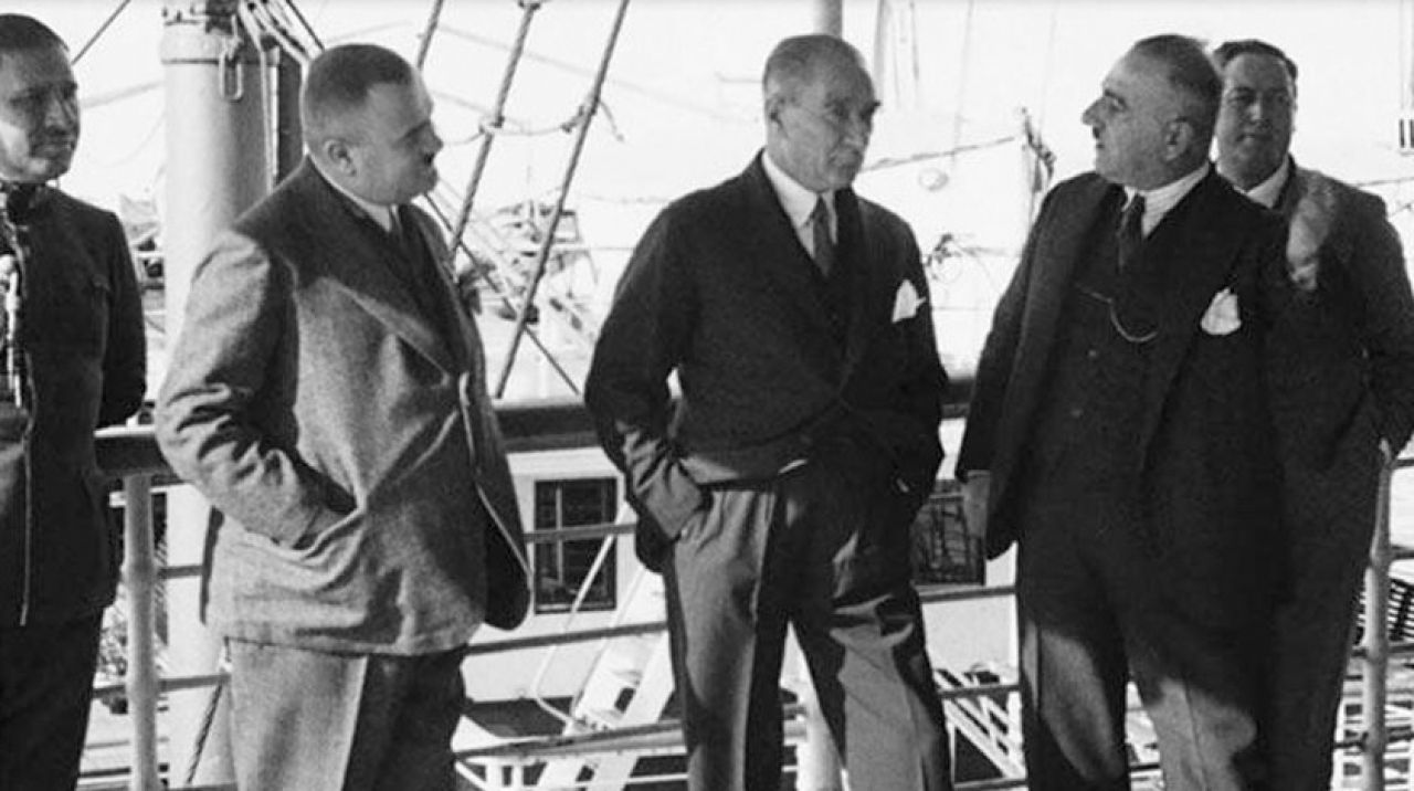 Atatürk’ün çocukluk arkadaşı ve ona en yakın isimlerden Salih Bozok, yanından hiç ayırmadığı Kılıç Ali ve başyaveri Cevat Abbas Gürer ile Trabzon’da Ege Vapuru içerisinde yer alan görüntü 1930 yılının Kasım ayına ait.