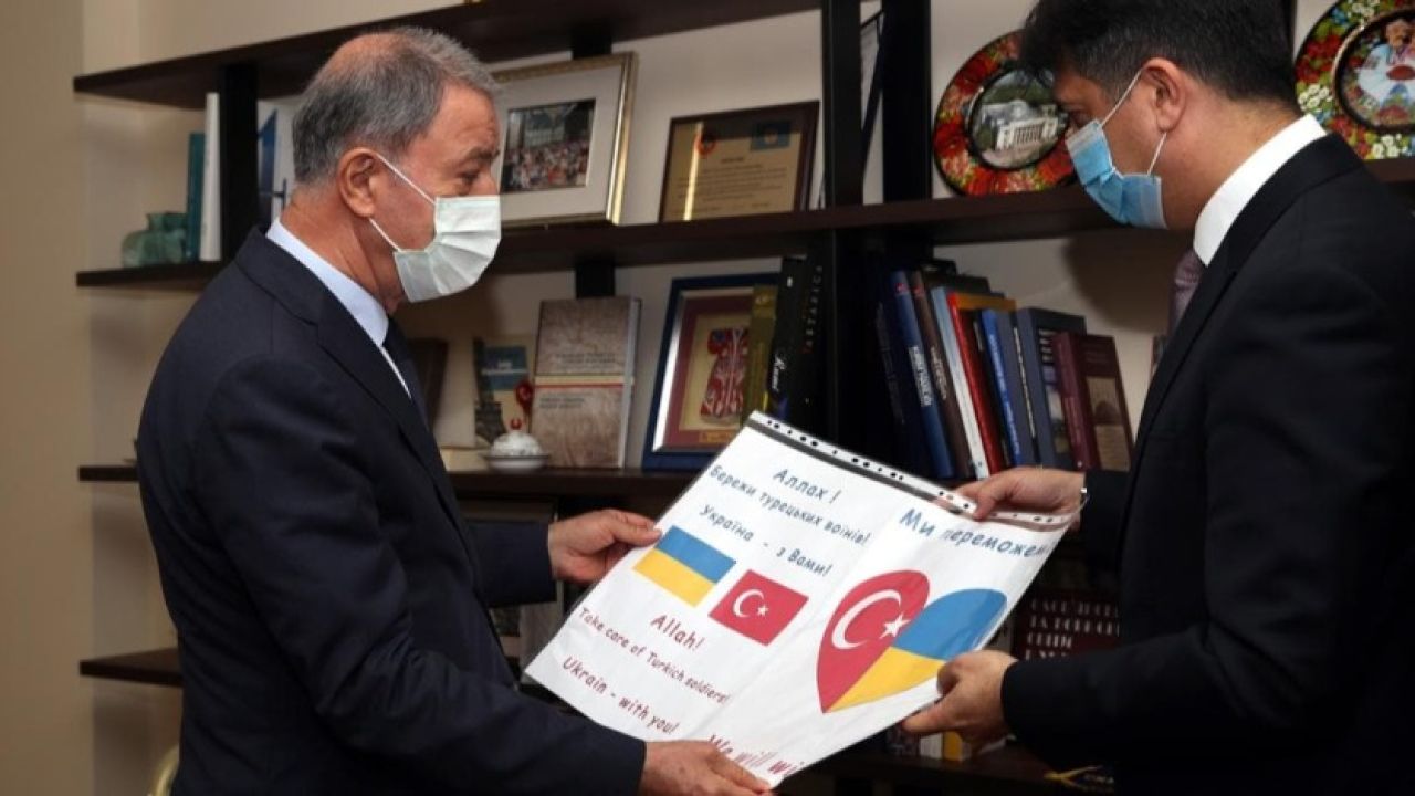 Türk ve Ukrayna bayraklarının da yer aldığı duygulandıran notu okuyan Akar, "Türkiye ve Ukrayna arasındaki dostluğun en güzel örneği." diye konuştu.