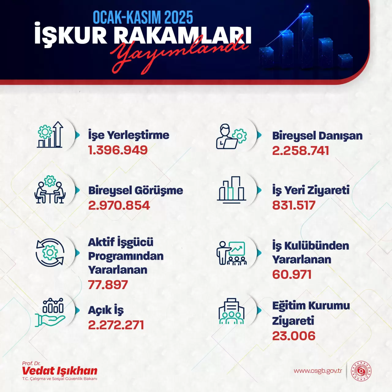 Çalışma ve Sosyal Güvenlik Bakanı Vedat Işıkhan, Türkiye İş Kurumu (İŞKUR) aracılığıyla iş bulanların sayısını açıkladı.