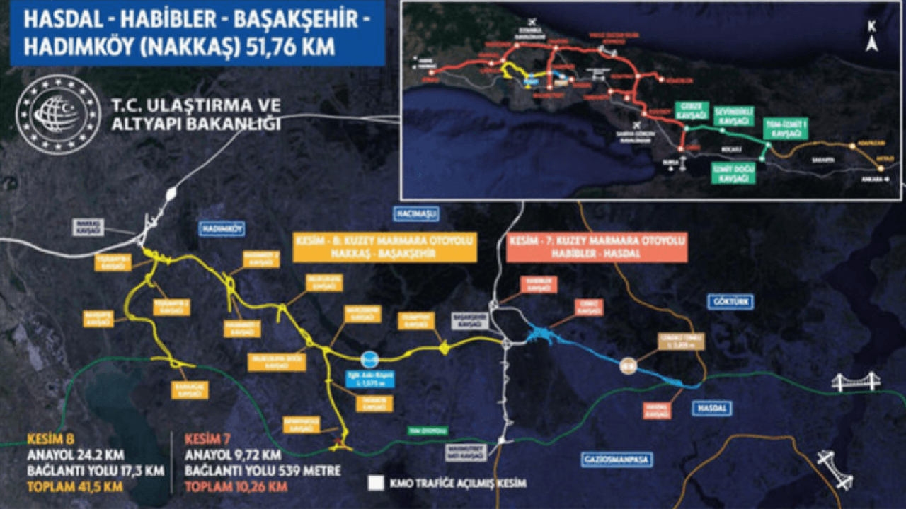 Bakan Karaismailoğlu Twitter'dan yaptığı açıklamada "Kuzey Marmara Otoyolu Projesi’nin 8669 kişiye istihdam sağlayan 10,25 km'lik Hasdal-Başakşehir kesiminde sona yaklaştık! Dünyanın en uzun dört şeritli otoyol tünelleri, akıllı ulaşım sistemlerine sahip KMO ile, Marmara bölgesinin ulaşımını hızlı ve konforlu hale getiriyoruz." dedi.