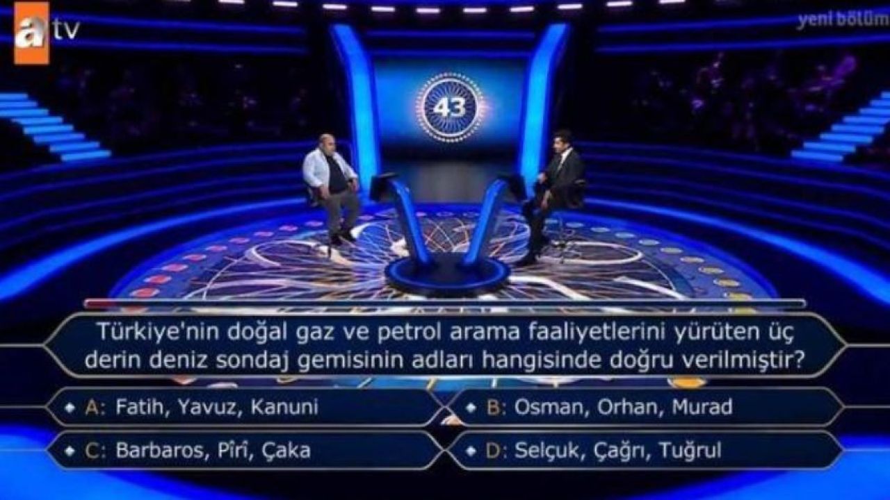 Ünlü oyuncu Kenan İmirzalıoğlu'nun sunumuyla atv'de ekranlara gelen "Kim Milyoner Olmak İster?" yarışma programında geçtiğimiz günlerde sorulan 10 bin TL'lik soru, "Türkiye'nin doğal gaz ve petrol arama faaliyetlerini yürüten üç derin deniz sondaj gemisinin adları hangisinde doğru verilmiştir?" oldu.