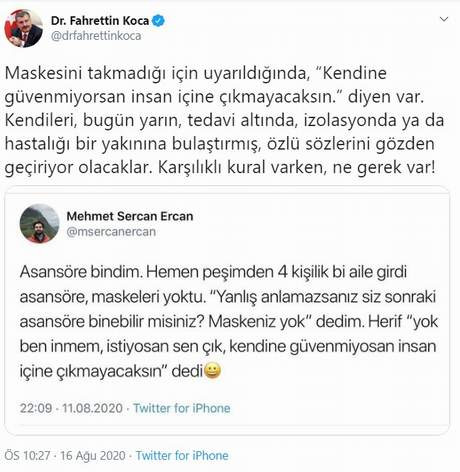 Bir sosyal medya kullanıcısının, ''Asansöre bindim. Hemen peşimden 4 kişilik bi aile girdi asansöre, maskeleri yoktu. “Yanlış anlamazsanız siz sonraki asansöre binebilir misiniz? Maskeniz yok” dedim. Herif “yok ben inmem, istiyosan sen çık, kendine güvenmiyosan insan içine çıkmayacaksın” ifadelerini alıntılayan Bakan Koca, şu ifadeleri kullandı: