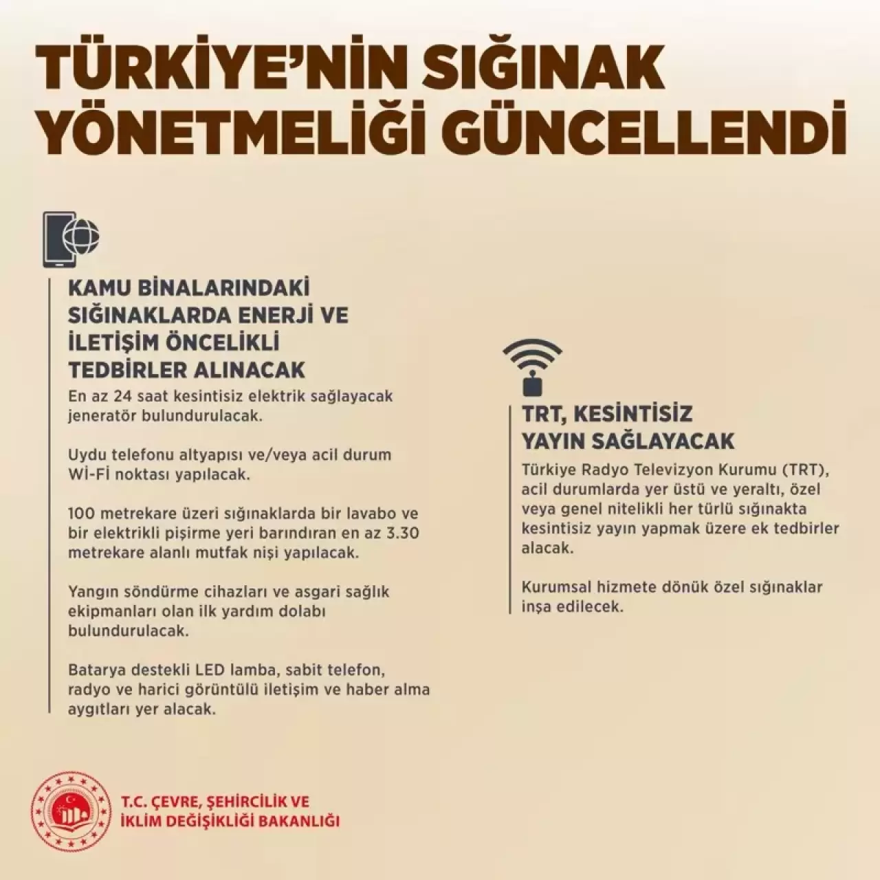 Çevre, Şehircilik ve İklim Değişikliği Bakanlığı, 6 ay süren çalışmalar kapsamında Türkiye'nin sığınak yönetmeliğini güncelledi. Resmi Gazete'de yayımlanarak yürürlüğe giren yeni düzenlemelerle ilgili sosyal medya hesabından paylaşım yapan Bakan Kurum, Türkiye'nin sığınak yönetmeliğini bugünün ihtiyaç ve şartlarına uygun olacak şekilde güncellediklerini açıkladı.