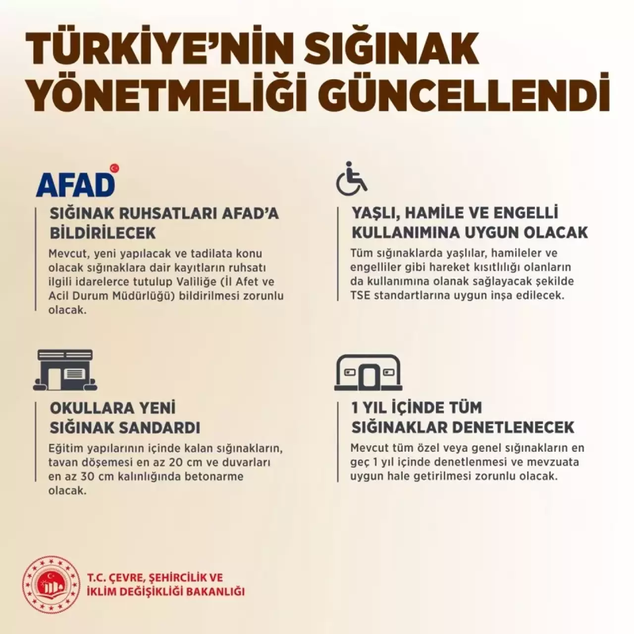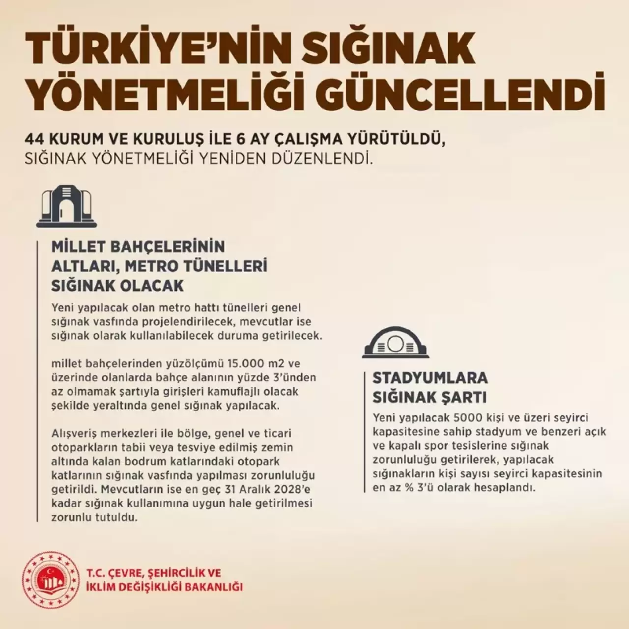 Türkiye'nin sığınak yönetmeliği, nüfus artışı ve şehirleşme gibi çağın şartları göz önünde bulundurularak Çevre, Şehircilik ve İklim Değişikliği Bakanlığı Mesleki Hizmetler Genel Müdürlüğü koordinasyonunda güncellendi. 44 farklı kurum ve kuruluş ile iş birliği içinde yürütülen çalışmalar 6 ayda tamamlandı. Yönetmelik değişikliği ile ilgili sosyal medya hesabından paylaşım yapan Bakan Kurum, "Ülkemizin sığınak yönetmeliğini günümüz ihtiyaç ve şartlarına uygun hale getirerek güncelledik. Mevcut sığınaklara denetim şartı ve ilave standartlar, yeni yapılacak binalara önemli şartlar getirdik. Resmi Gazete'de yayımlanan yönetmeliğimizle; millet bahçeleri, metro tünelleri gibi alanları sığınak hizmeti verecek şekilde düzenleyeceğiz. Milletimizin huzur ve güveni için gereken her adımı atmaya devam edeceğiz" diye konuştu.
