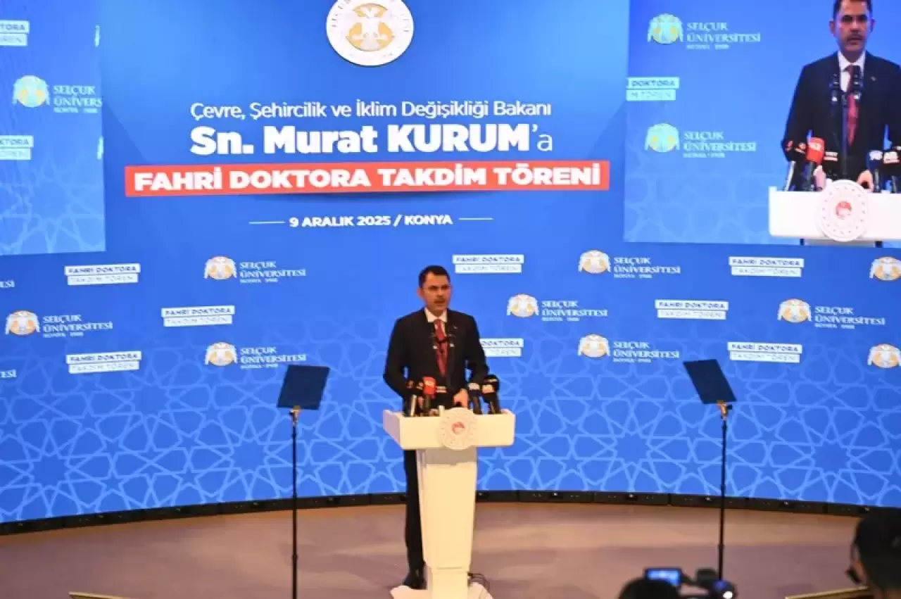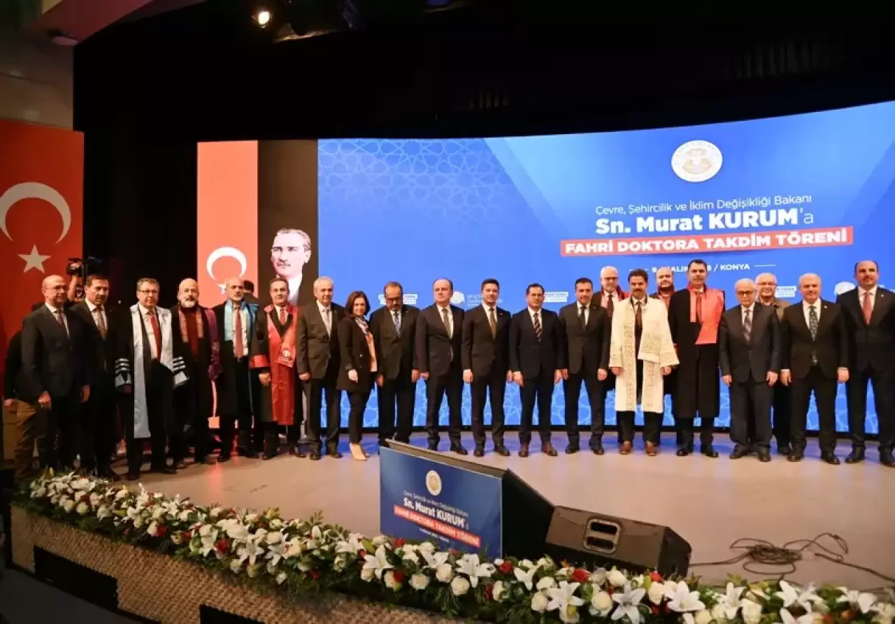 Konuşmaların ardından Selçuk Üniversitesi Rektörü Prof. Dr. Hüseyin Yılmaz tarafından Bakan Murat Kurum'a fahri doktora ünvanı verildi.