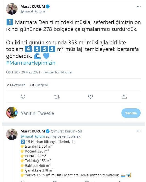 Kurum, "Marmara Denizi'mizdeki müsilaj seferberliğimizin 12'nci gününde 278 bölgede çalışmalarımızı sürdürdük. 12'nci günün sonunda 353 metreküp müsilajla birlikte toplam 4 bin 555 metreküp temizleyerek bertarafa gönderdik. 19 Haziran itibarıyla illerimizde; İstanbul 1584 metreküp, Kocaeli 326 metreküp, Bursa 133 metreküp, Tekirdağ 153 metreküp, Balıkesir 466 metreküp, Çanakkale 378 metreküp, Yalova 1515 metreküp müsilajı Marmara Denizi'mizden temizledik" dedi.