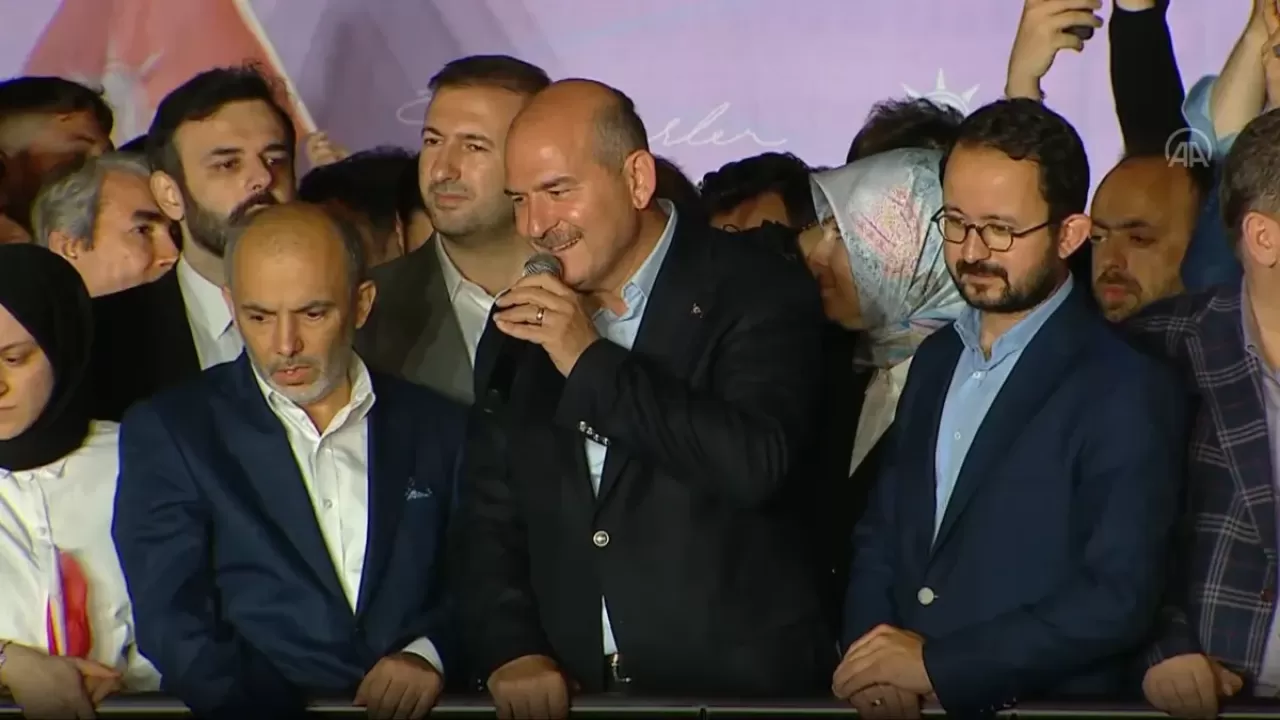 Vatandaşlar hitap eden İçişleri Bakanı Süleyman Soylu, " Kıymetli dava arkadaşlarım büyük bir mücadele verdiniz. Kıymetli Cumhurbaşkanımızın liderliğinde Türkiye'yi etrafımızdaki coğrafyayı bizden ümidi olanları, afet bölgesinde el ele olduğumuz gönül gönüle olduğumuz bütün afetzedeleri yaptığınız çalışmayla ortaya koyduğunuz gayretle mücadele il ümit var ettiniz. Bu seçimi Türkiye kazandı. Bu seçimi balkan coğrafyası Rumelili kardeşlerimiz kazandı. Bu seçimi mağdurlar ve mazlumlar kazandı. Bütün Türkiye'ye teşekkür ediyoruz. Biz sadece Türkiye'ye Cumhurbaşkanı seçmedik biz dünyaya lider seçtik. Yarın yeni bir gün başlıyor. Yarın yeni bir umut başlıyor. Yarın yepyeni bir kardeşlik başlıyor. Önümüzdeki 5 yıl Recep Tayyip Erdoğan'ın liderliğinin zirvesi olacak. Daha yeni başlıyoruz.