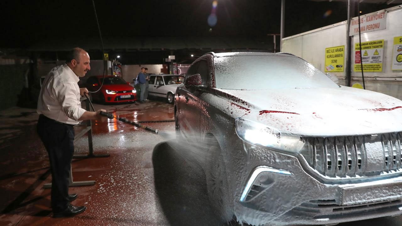Araca önce köpük püskürten Varank, daha sonra süngerle sildi. Bakan Varank, Togg'u tazyikli suyla yıkadıktan sonra oto yıkamacıdan ayrıldı.