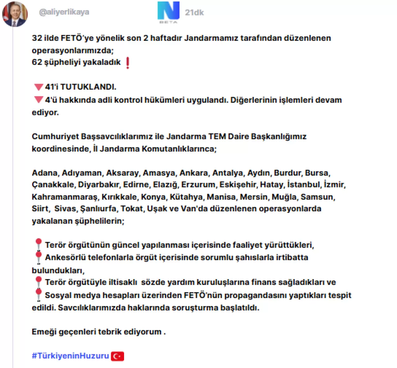 İçişleri Bakanı Ali Yerlikaya, Cumhuriyet başsavcılıkları ile Jandarma TEM Daire Başkanlığı koordinesinde, İl Jandarma Komutanlıklarınca; Adana, Adıyaman, Aksaray, Amasya, Ankara, Antalya, Aydın, Burdur, Bursa, Çanakkale, Diyarbakır, Edirne, Elazığ, Erzurum, Eskişehir, Hatay, İstanbul, İzmir, Kahramanmaraş, Kırıkkale, Konya, Kütahya, Manisa, Mersin, Muğla, Samsun, Siirt, Sivas, Şanlıurfa, Tokat, Uşak ve Van'da FETÖ operasyonlarının düzenlendiğini duyurdu.
