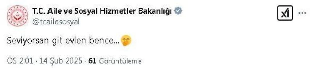 Bakanlığın sosyal medya hesabından '14 Şubat Sevgililer Günü' nedeniyle paylaşım yapıldı. Paylaşımda, "Seviyorsan git evlen bence" denildi.