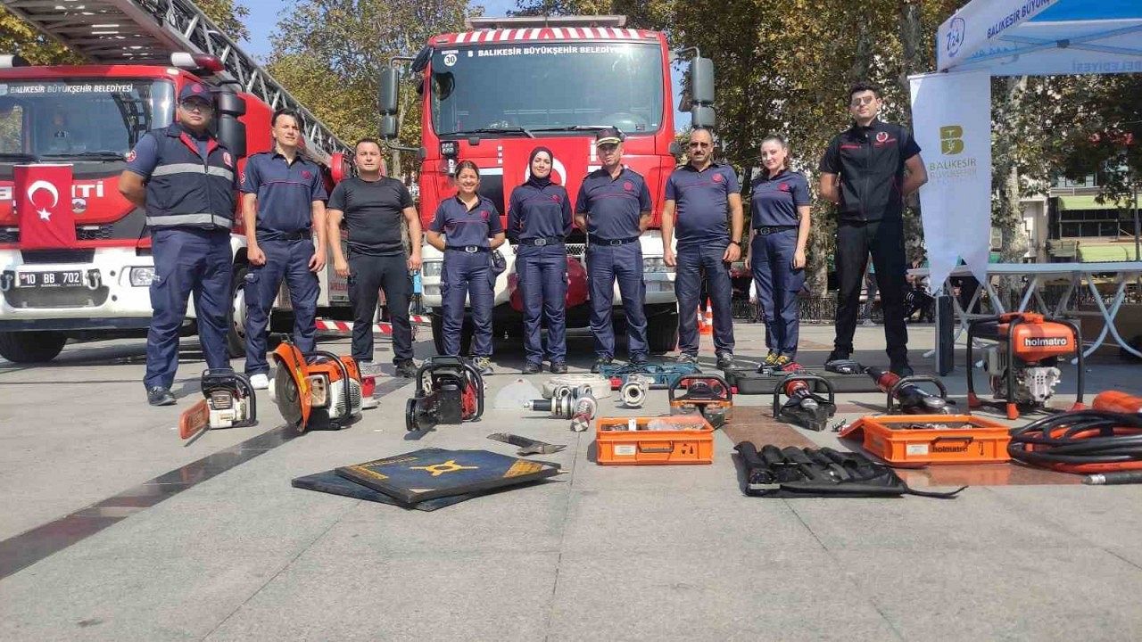 Balıkesir Büyükşehir Belediyesi Güney Marmara Gruplar Amiri Tarkan Tepeler, bilgilendirmelerde bulunarak “İtfaiye Haftası nedeniyle vatandaşları afetlere hazırlama noktasında bilgilendirme ve bilinçlendirme çalışmaları yapıyoruz. Bu tanıtım stantlarımızı il genelinde tüm ilçelerimizde gerçekleştiriyoruz. Burada afetlerde kullandığımız ilk yardım ve kurtarma malzemelerimizi sergiliyoruz. Vatandaşlarımıza bu malzemelerin hangi konumda ve nasıl kullanacağımızı anlatacağız. Güney Marmara Gruplar Amirliği bünyesinde 53 personel, 5 adet ilk müdahale aracımız, 2 merdivenli aracımız olmak üzere toplam 7 aracımızla çalışmalara devam ediyoruz” ifadelerinde bulundu.