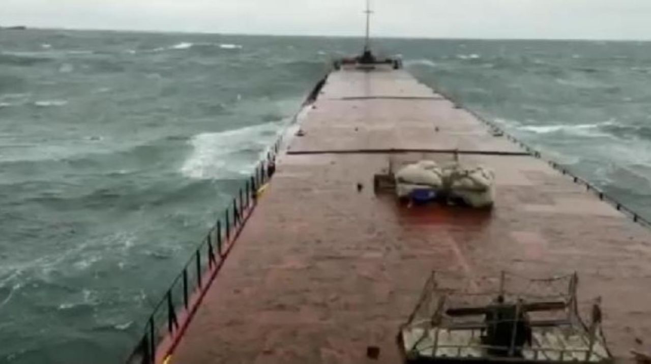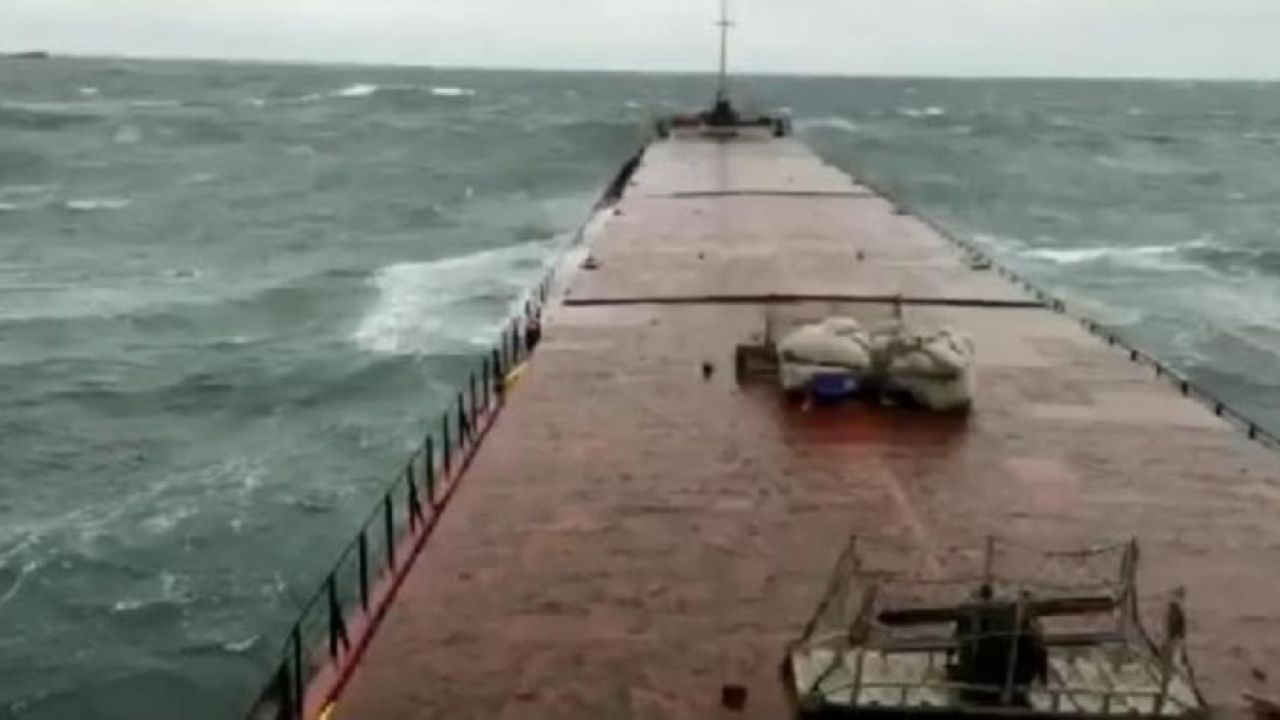 Gemiye sabitlenen bir telefonun kamerasına, ana güverte bölümünün dalgaların etkisiyle ikiye bölünme anı yansıdı.