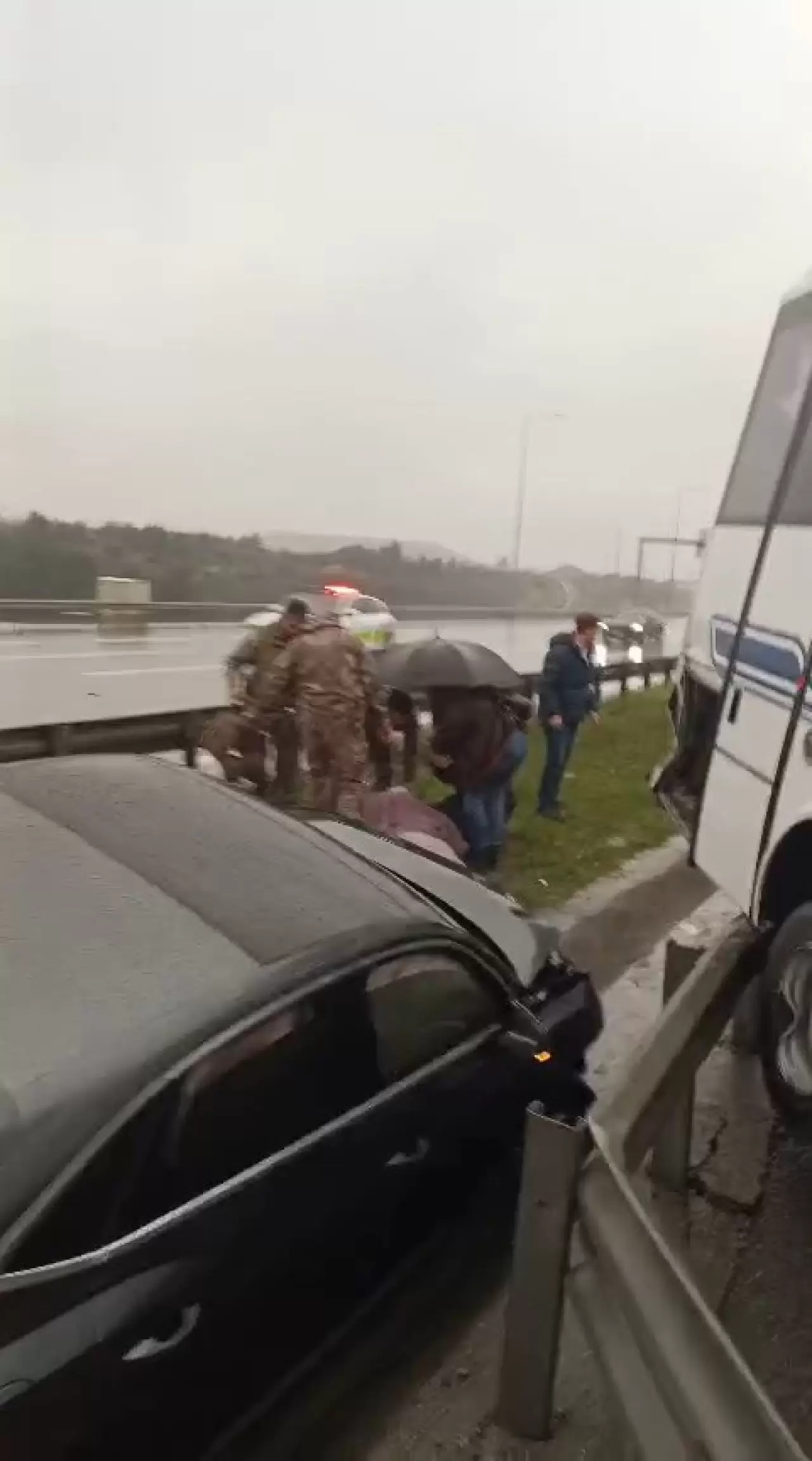 Kaza, saat 09.00 sıralarında Kuzey Marmara Otoyolu Başakşehir-Habipler Bağlantı yolunda meydana geldi. Polisleri taşıdığı öğrenilen servis aracı ile otomobilin karıştığı kazada servis minibüsü bariyerlere çarparak durabilirken otomobil refüje düştü.