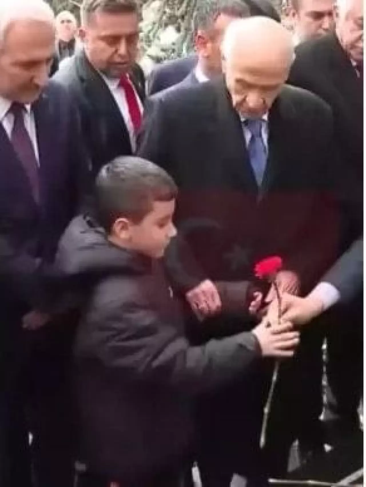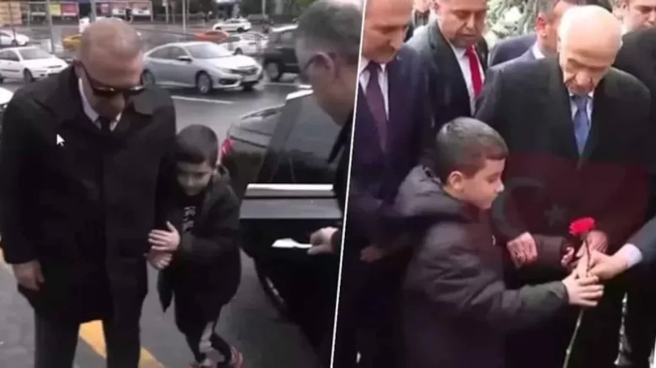 Ziyaret esnasında bir çocuğu yanına çağıran Bahçeli, birlikte mezarlığa karanfil bıraktı.