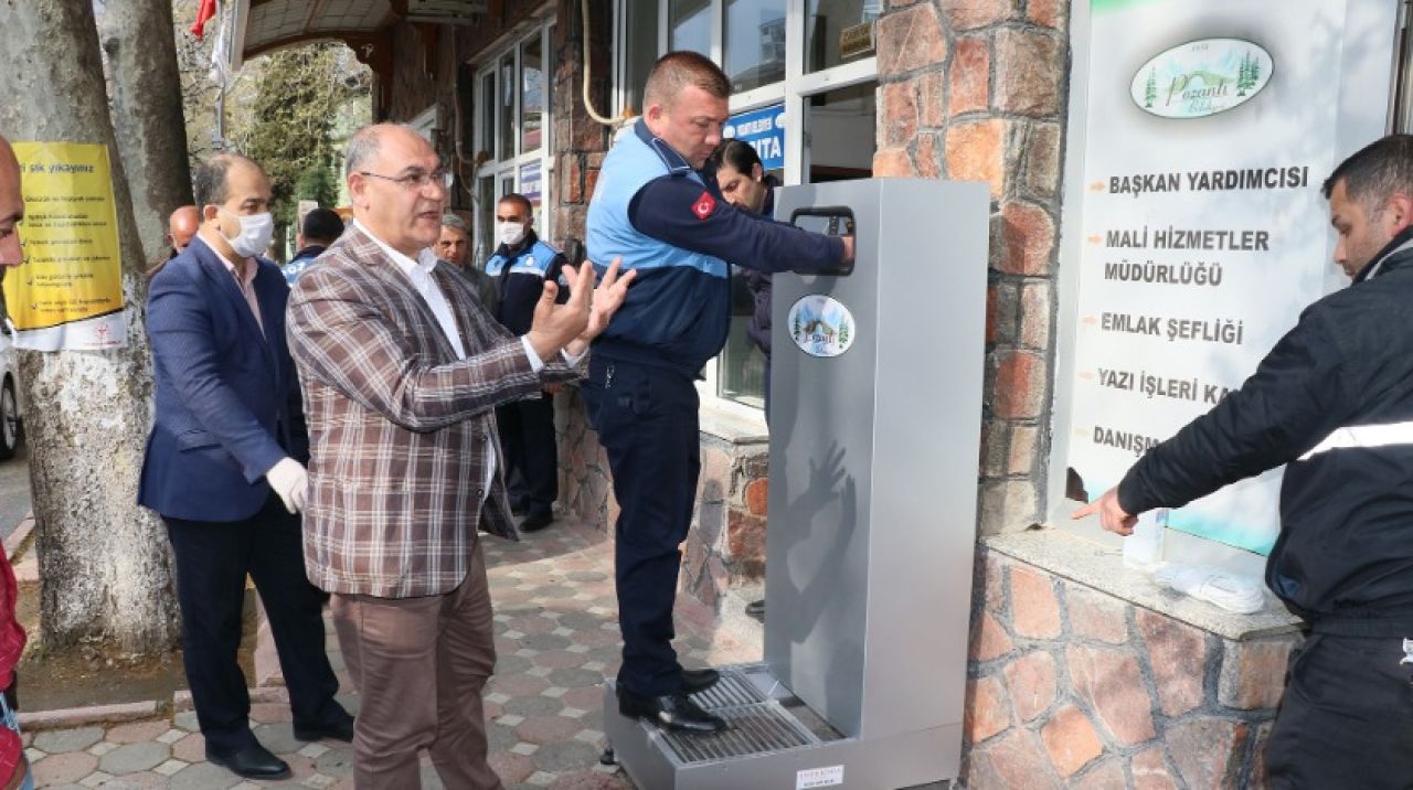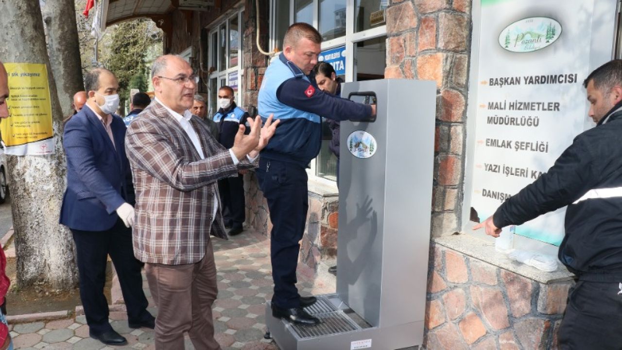 Belediye Ekipleri tarafından durmaksızın cadde ve sokakları dezenfekte ettirip temizlik ve hijyen konusuna dikkat çeken Başkan Mustafa Çay, şimdide vatandaşların korunmasına daha da önem vererek el ve ayak dezenfektan makinesi aldı.