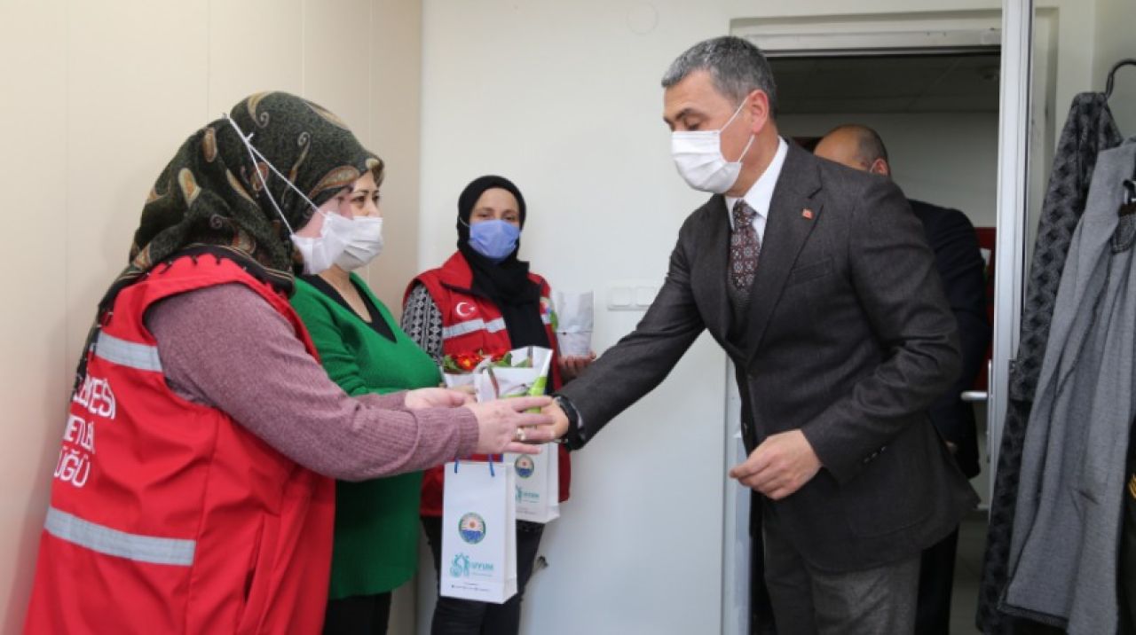 Park ve Bahçeler Müdürlüğü’ne ait serada üretilen çuha çiçeğini ve UYUM öğrencileri tarafından yapılan karo çalışmasını kadınlara takdim eden Başkan Ramazan Şimşek “Tarihimiz boyunca yaptıkları mücadele, fedakârlık ve başarıları ile örnek olan, aile kurumunun temel taşı, değerlerimizin temsilcisi ve koruyucusu, şefkatin ve özverinin sembolü olan Türk kadınlarının, 8 Mart Dünya Kadınlar Günü kutlu olsun” dedi.