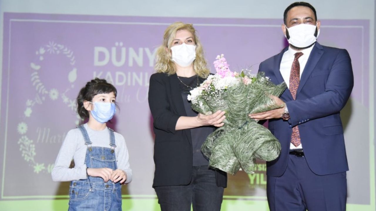 Başkan Yılmaz, konuşmasının ardından tüm kadınlar adına eşi Meltem Yılmaz'a çiçek ve hediye takdim ederek Dünya Kadınlar Günü'nü kutladı.