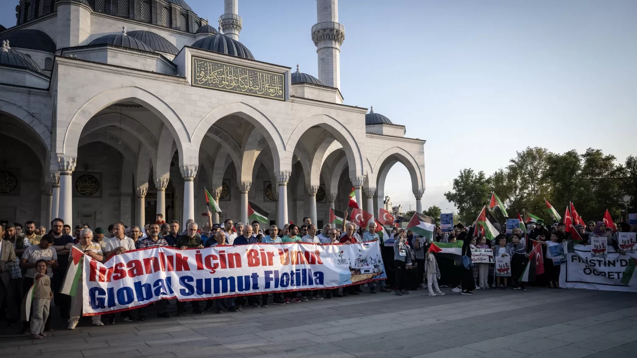 Türk ve Filistin bayrakları ile afişler taşıyan katılımcılar, "Ankara'dan Sumud'a direnişe bin selam", "Yükümüz vicdan, rotamız Gazze", "İnsanlığın onuru Sumud filosu" sloganları attı.