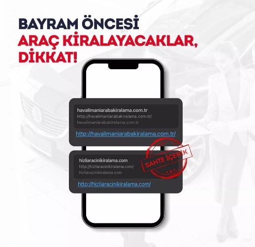 Yapılan açıklamada, araç kiralamasının yapılacağı sitenin güvenilirliğinin önemine vurgu yapılarak, "Kiralama yapacağınız internet sitelerinin URL adreslerinde sitenin güvenli olduğunu tanımlayan https:// protokolü olup olmadığını kontrol edin. İnternet sitelerinin arama motoru sonuçlarında üst sıralarda çıkmasının o sitenin güvenilir olduğu anlamına gelmeyeceğini unutmayın. Ödemelerinizi kişisel hesaplara değil, şirket veya firma hesaplarına ödemeyi tercih edin. Düşük ücretlendirmelere karşı şüpheyle yaklaşın. Şüphe duydunuz durumlarda, fiziki olarak görmediğiniz araçlar için herhangi bir ödeme/ön ödeme gerçekleştirmemeye özen gösterin" denildi.