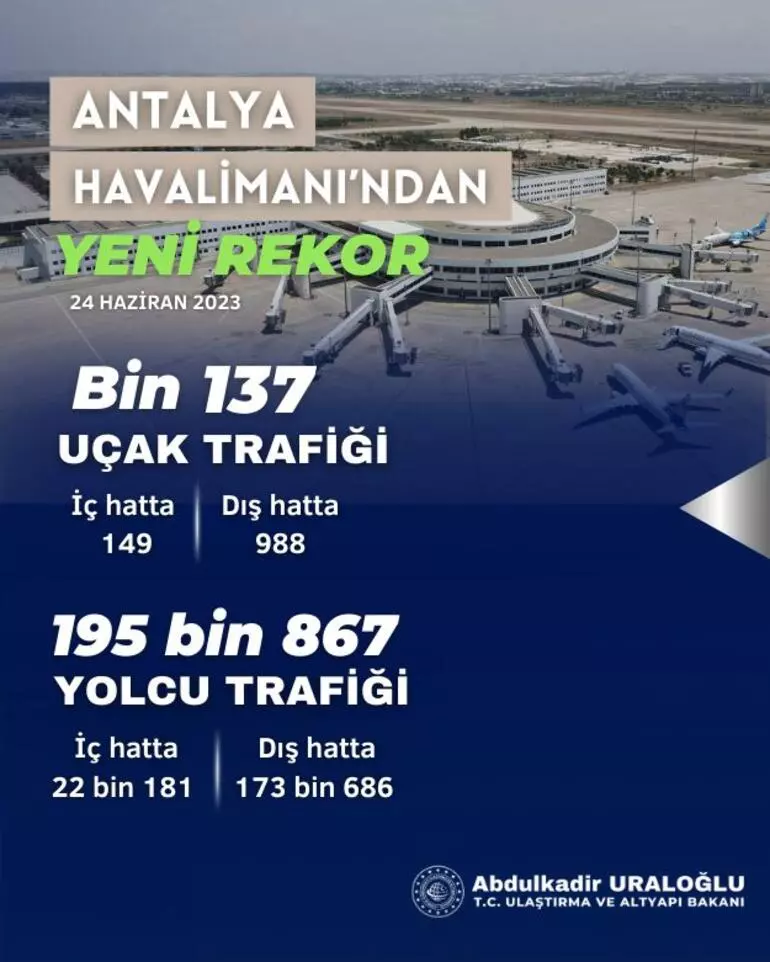Özellikle hava yolu taşımacılığında da yoğunluk hat safhaya çıktı. Antalya Havalimanı’ndaki yolcu yoğunluğu uçak seferlerine de yansıdı. Antalya Havalimanı’nda 24 Haziran 2023 Cumartesi günü iç hatta 149, dış hatta 988 olmak üzere toplamda 1137 uçak trafiğine hizmet verdi. Aynı gün yolcu trafiği ise iç hatta 22 bin 181, dış hatta 173 bin 686 olmak üzere toplam 195 bin 867 olarak gerçekleşti. Geçen yılın en yüksek rakamı olan 1094 sayısı geçilerek bu yılın en yüksek rakamına ulaşıldı. Aynı gün yolcu trafiği ise iç hatta 22.181, dış hatta 173.686 olmak üzere toplam 195.867 olarak gerçekleşmiş, geçen yılın en yüksek rakamı olan 1.094 sayısı geçilerek, rekor artış gerçekleşti.