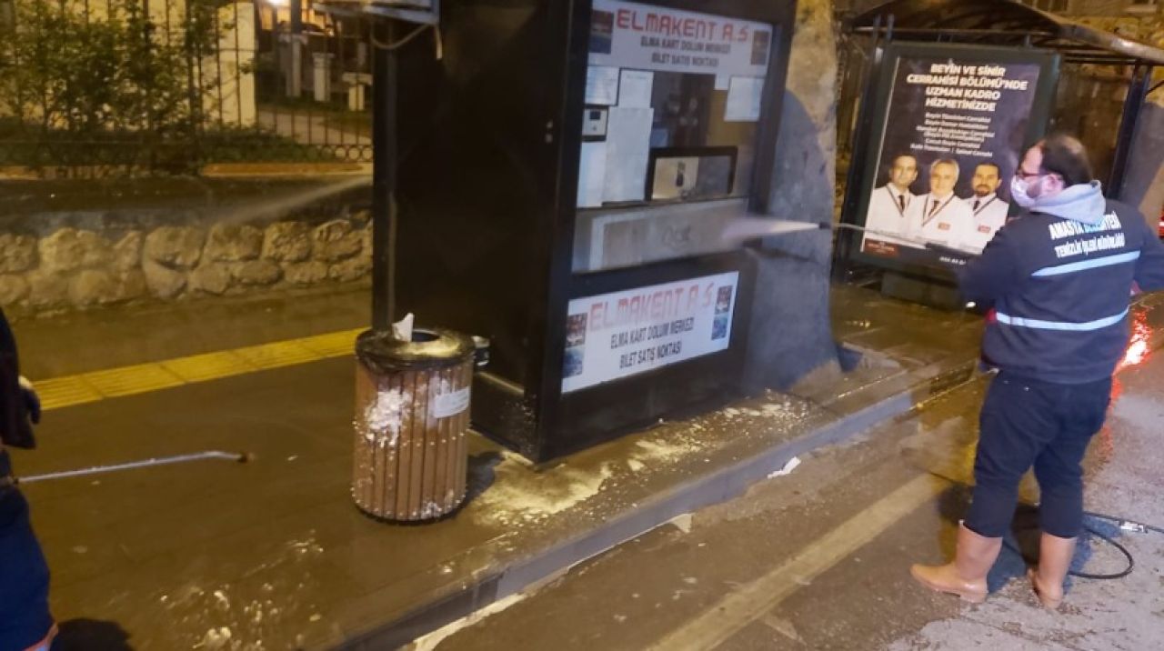 Şehrin her noktasında bulunan cadde, sokak, otobüs durakları, çöp konteynırları, demir korkuluklar Amasya Belediyesi Temizlik İşleri Müdürlüğü ekipleri tarafından özenle dezenfekte edilerek, gece gündüz bol köpüklü deterjanlı suyla yıkanıyor.