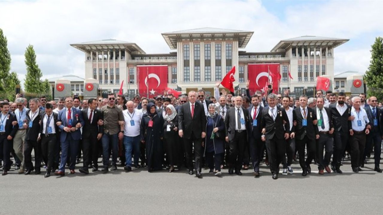 Erdoğan, 15 Temmuz Demokrasi ve Milli Birlik Günü dolayısıyla Cumhurbaşkanlığı Külliyesi karşısındaki 15 Temmuz Şehitler Abidesi'ne çiçek bırakmasının ardından, beraberindeki şehit yakınları ve gazilerle yürüyerek Beştepe Millet Camisi'ne geçti.