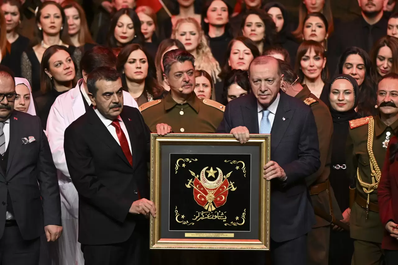Gösterimin ardından Bakan Tekin, Erdoğan'a, "Yaşasun Askerler Bir Veda Bir Vefa" sembolünün yer aldığı, Tokat'ın yazmacılarının elinden çıkan, Birinci Dünya Savaşı'nın en çetin yıllarında cepheye uğurlanan "Onbeşliler"in heybesinde birer dua gibi bırakılan mendilin bulunduğu "Yaşasun Askerler Tablosu"nu hediye etti.