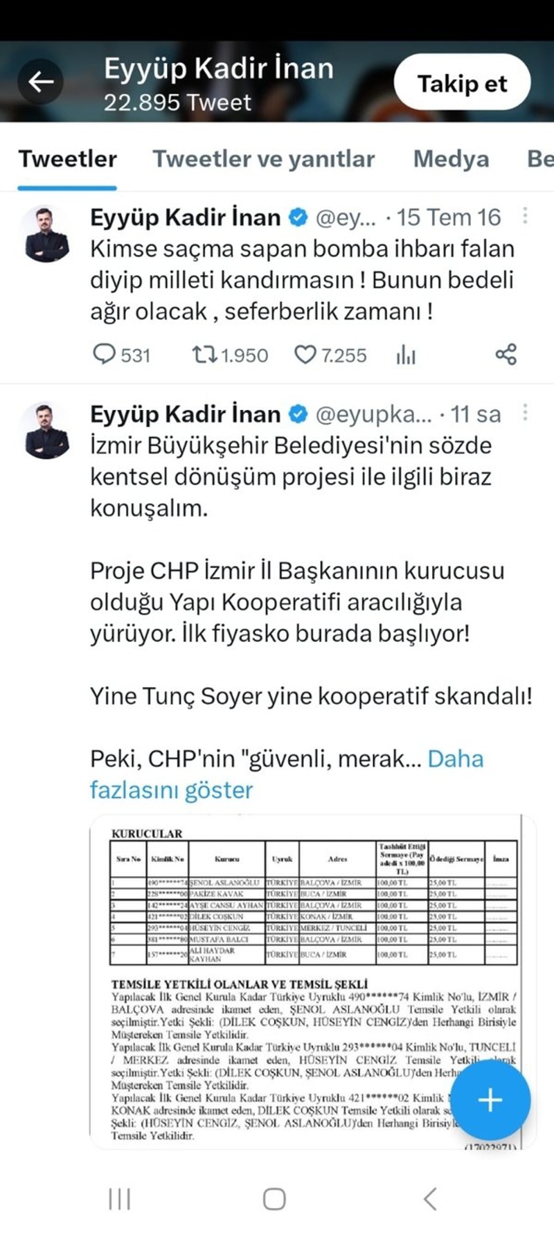 İnşaatlarda eksik demir ve hatalı beton kullanıldığına ilişkin skandal AK Parti Gençlik Kolları Genel Başkanı ve İzmir Milletvekili Eyyüp Kadir İnan'ın yaptığı açıklama ile ortaya çıkmıştı. İnan twetter hesabı üzerinden yaptığı açıklamada: "İzmir Büyükşehir Belediyesi'nin sözde kentsel dönüşüm projesi ile ilgili biraz konuşalım. Proje CHP İzmir İl Başkanının kurucusu olduğu Yapı Kooperatifi aracılığıyla yürüyor. İlk fiyasko burada başlıyor! Yine Tunç Soyer yine kooperatif skandalı! Peki, CHP'nin "güvenli, merak etmeyin" dediği inşaat raporlarında ortaya ne çıktı? Projede demir eksikliği ve hatalı beton imalatı... Evet! Daha yeni büyük bir felaket atlatmışken ortadaki tablo bu! Depremden büyük yaralar almış şehrimizde bu sorumsuzluk da nedir? Siz insanımızın hayatını bu kadar mı önemsiz görüyorsunuz? Hala ders almayacak mısınız?" ifadelerini kullanmıştı.