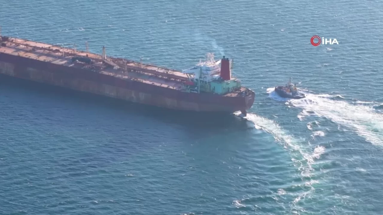 Petrol tankerine müdahale anları ise havadan dron ile görüntülendi. Havadan çekilen görüntülerde, sahil güvenlik botları ve römorkörlerin gemiye yanaştığı anlar yer aldı.