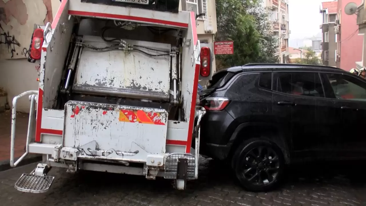 İstanbul Beyoğlu'nda yağmur nedeniyle kayganlaşan yolda aracının direksiyon hakimiyetini kaybeden çöp kamyonu şoförü, park halindeki 5 araca, ardından da bir evin duvarına çarptı.