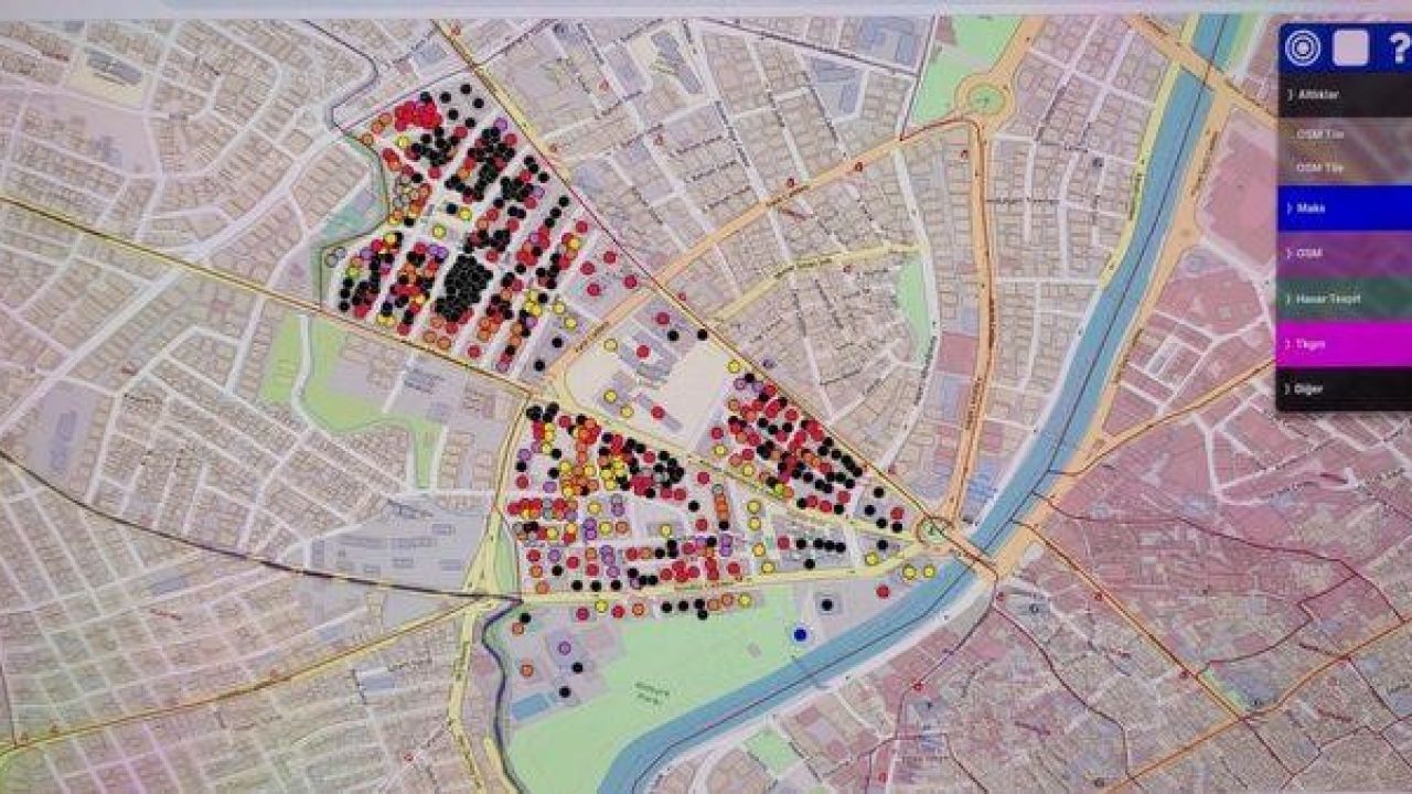 Kırmızı renkle işaretlenmiş yerler ağır hasarlı, turuncu renkle işaretlenmiş yerler orta hasarlı, sarı renkle işaretlenmiş yerler az hasarlı, siyah renkle işaretlenen yerler yıkık, mor renkle işaretlenmiş yerler acil yıktırılacak, yeşil renkle işaretlenmiş yerler ise hasarsız olarak değerlendirildi.