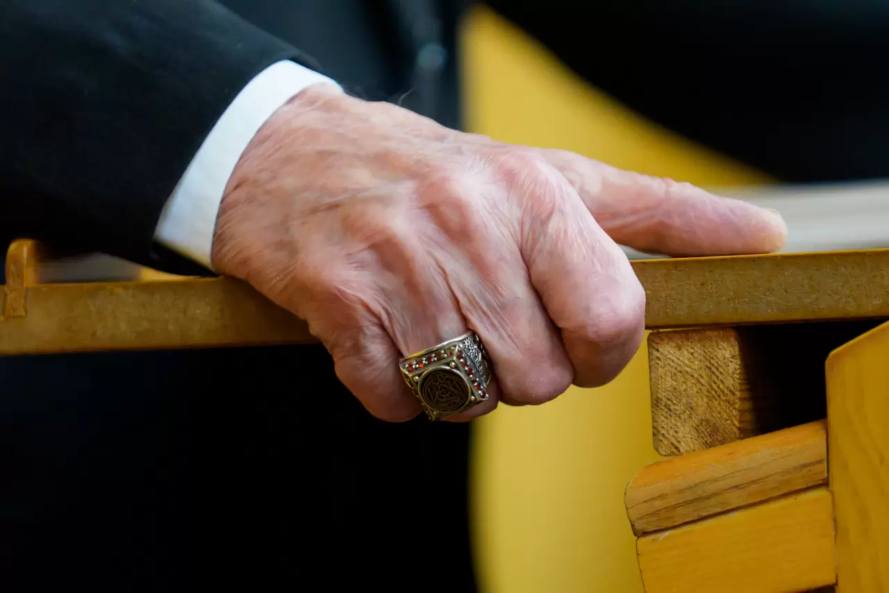 Taktığı yüzüğün üst kısmında “La Galibe İllallah” yazılı yüzüğün yan taraflarında birinde Çift Başlı Selçuklu Kartalı, diğerinde ise Osmanlı Devlet Arması yer alıyor.